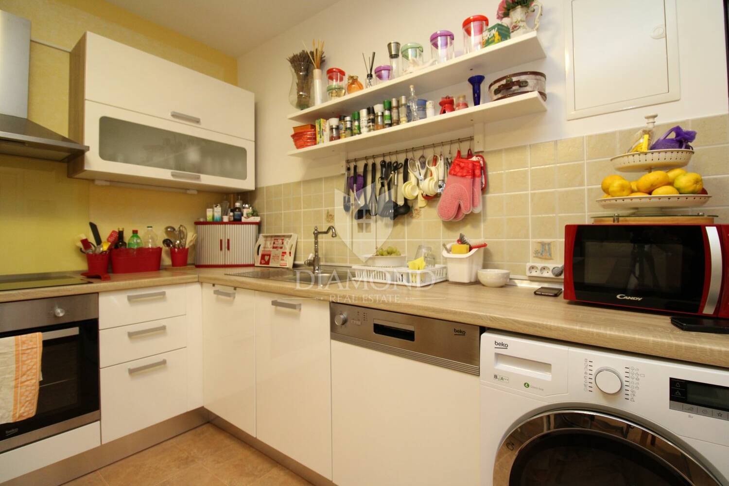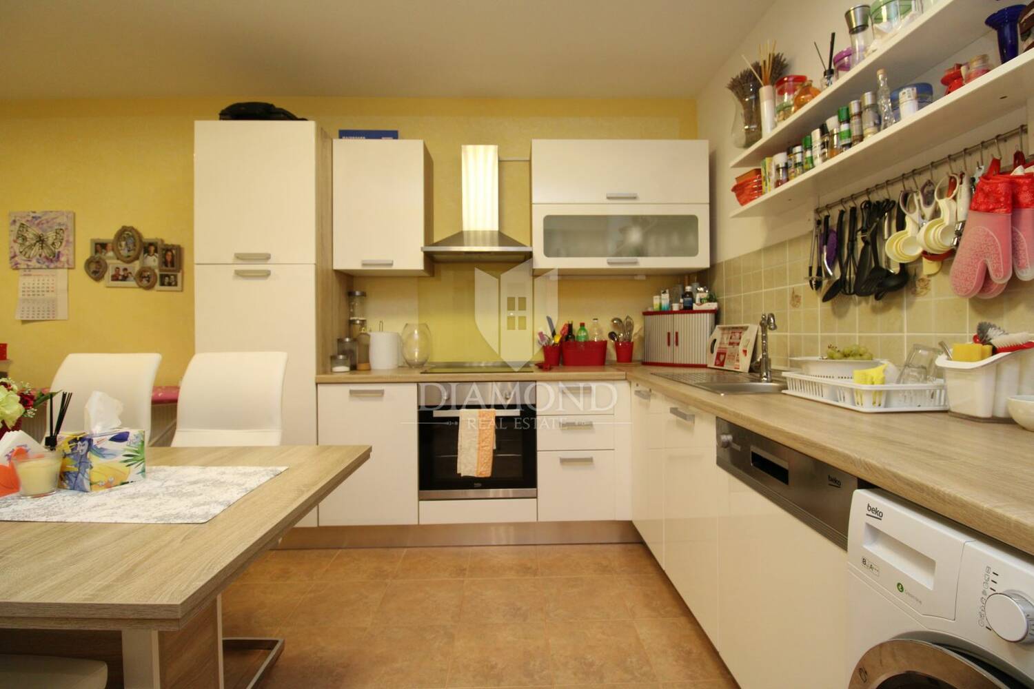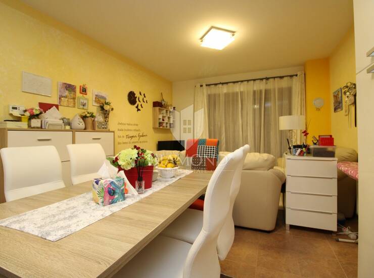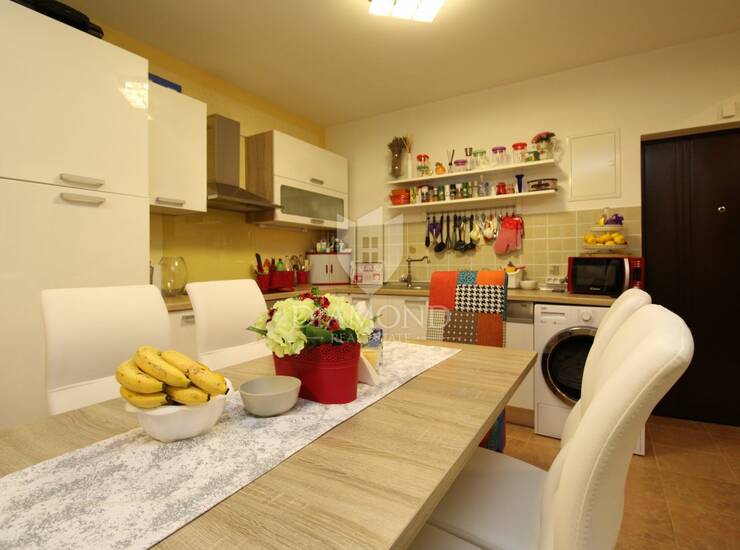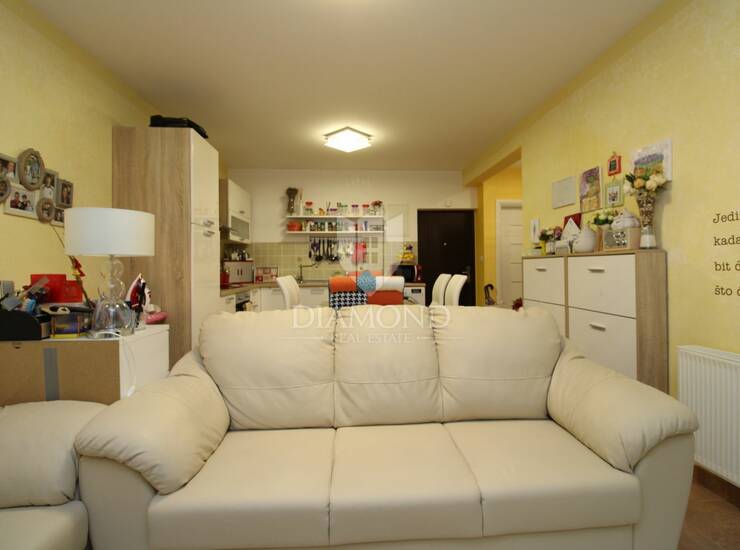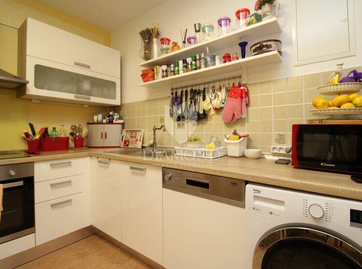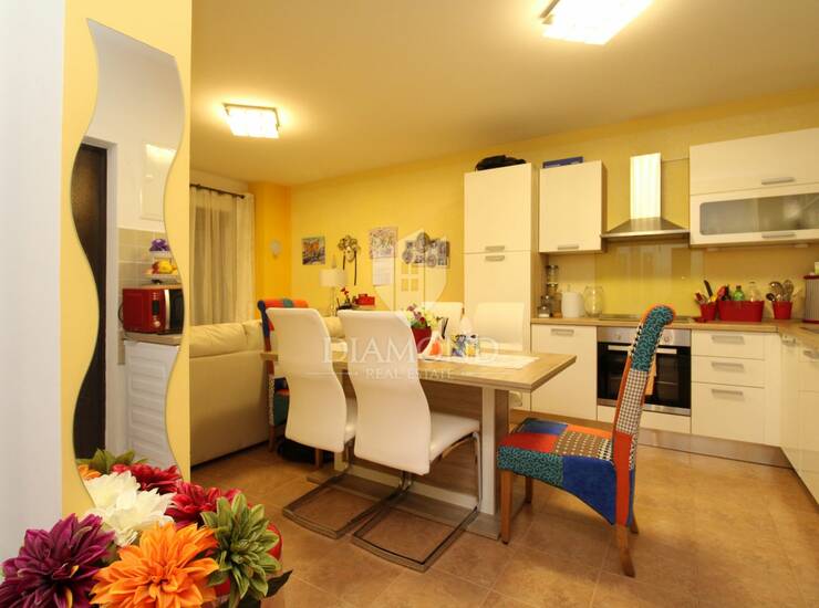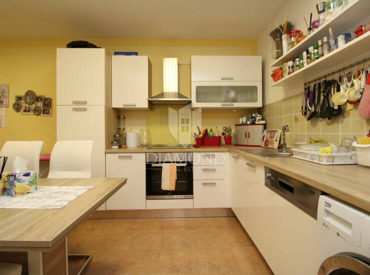 Stan se sastoji od prostranog dnevnog boravka, kuhinje s blagovaonicom, dvije spavaće sobe i kupaonice. Grijanje je centralno na plin, što omogućuje ugodan boravak tijekom cijele godine. Stanu pripada i velika ostava koja pruža dodatni prostor za pohranu, a ispred zgrade osiguran je parking.