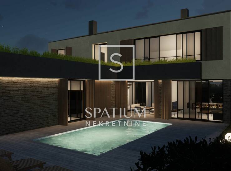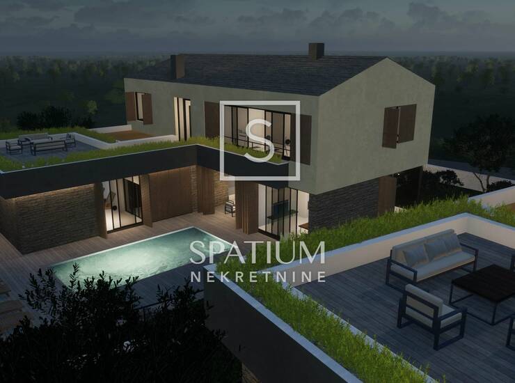 ISTRA, GRAČIŠĆE, u ponudi je ekskluzivna, luksuzna vila smještena u Istri, Gračišće, u mirnom naselju Batlug, nedaleko od grada Žminja. Vila se prostire na površini od 390 m², smještena na zemljištu od 898 m² i opremljena unutarnjim i vanjskim bazenom. Izgrađena je s najvišim standardima, spajajući tradicionalnu i modernu arhitekturu. Unutarnji prostor vile prostire se na 312 četvornih metara, s pažljivo uređenim interijerom koji pruža idiličan pejzaž, mir i potpunu privatnost. Vila će biti potpuno namještena vrhunskim i luksuznim namještajem. Projekt obuhvaća tri identične vile, namijenjene odmoru većih obitelji ili grupa prijatelja. U prizemlju se nalazi prostrani dnevni boravak s povezanom blagovaonicom i visokokvalitetnom kuhinjom s velikim šankom, pružajući idealno mjesto za uživanje većim skupinama ljudi. Poseban dio vile sadrži wellness prostor s unutarnjim bazenom i saunom. Na katu se nalazi dodatna velika terasa, tri spavaće sobe s vlastitim kupaonicama, luksuzno kućno kino te vrhunski opremljena teretana s kupaonicom, koja je usmjerena prema sunčalištu na prizemlju. Posebna pažnja posvećena je prostoru za odmor i druženje na otvorenom, s naglaskom na vanjski bazen sa sunčalištem. Između dnevnog boravka i kuhinje nalazi se natkrivena terasa, dok se na sjevernoj strani nalazi terasa s roštiljem, prekrivena drvenom pergolom. Obje terase su izravno povezane sa sunčalištem, wellness prostorom i dnevnim boravkom.