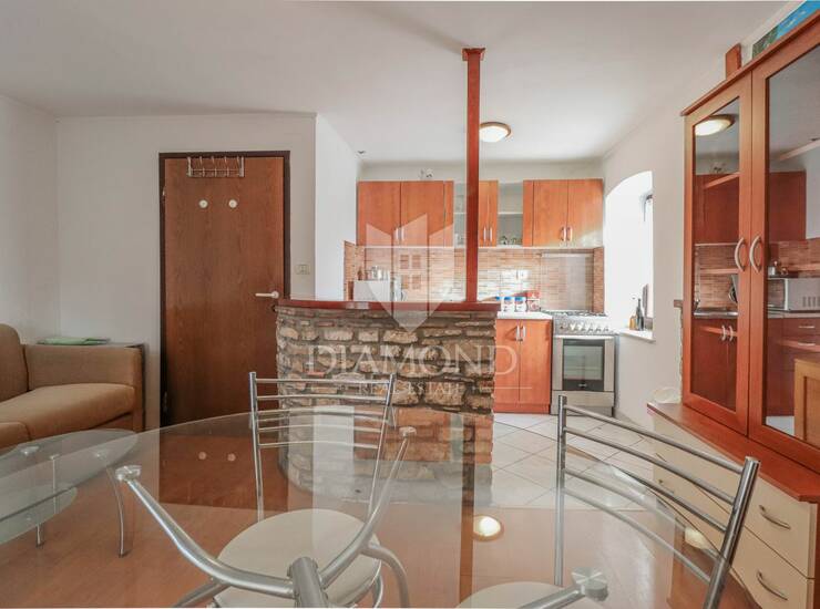 Kuća se sastoji se od dva stana sa odvojenim ulazima. Prvi, veći stan, proteže se na tri etaže. U prizemlju sadrži dnevnu sobu, kupaonicu i hodnik sa kojih se pristupa na natkrivenu terasu sa ljetnom kuhinjom i prekrasnim vrtom. Na 1. katu se nalazi kuhinja sa blagovaonicom sa izlazom na terasu, a na 2. katu su smještene dvije spavaće sobe. Drugi stan je u fazi renovacije. Vanjskim kamenim stepenicama dolazi se na 1. kat gdje se nalazi dnevni boravak sa kuhinjom i blagovaonicom te kupaonica. Na 2.katu se nalazi jedna velika spavaća soba. Grijanje je na peć na drva. Kući pripada i garaža, koja se po želji može pretvoriti u kantinu. Građena je u Istarskom stilu, sa prekasnim detaljima kamena i drva što joj daje prekrasna autohtoni stil.