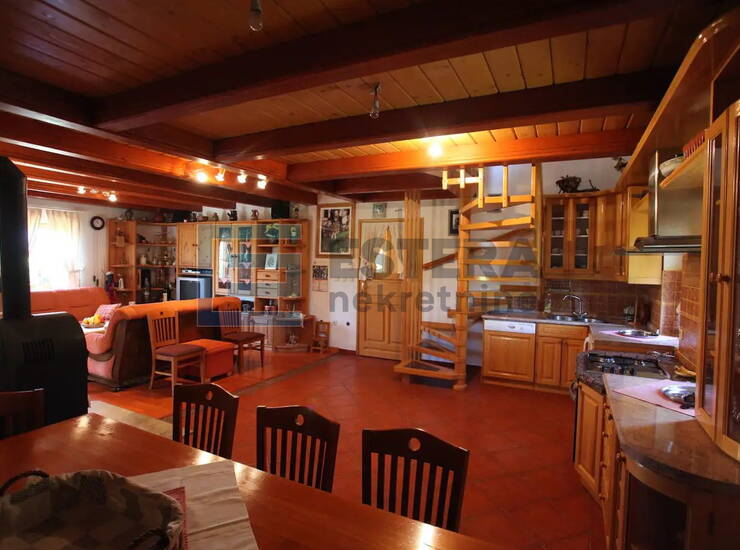 Prizemlje kuće sastoji se od: hodnika, kompletno opremljene moderne kuhinje izrađene po mjeri od punog drveta, ugodnog dnevnog boravka sa kaminom koji grije cijeli stambeni dio, kupaonice (tuš) sa wc-om te blagovaonice iz koje se izlazi na natkrivenu terasu sa roštiljem.