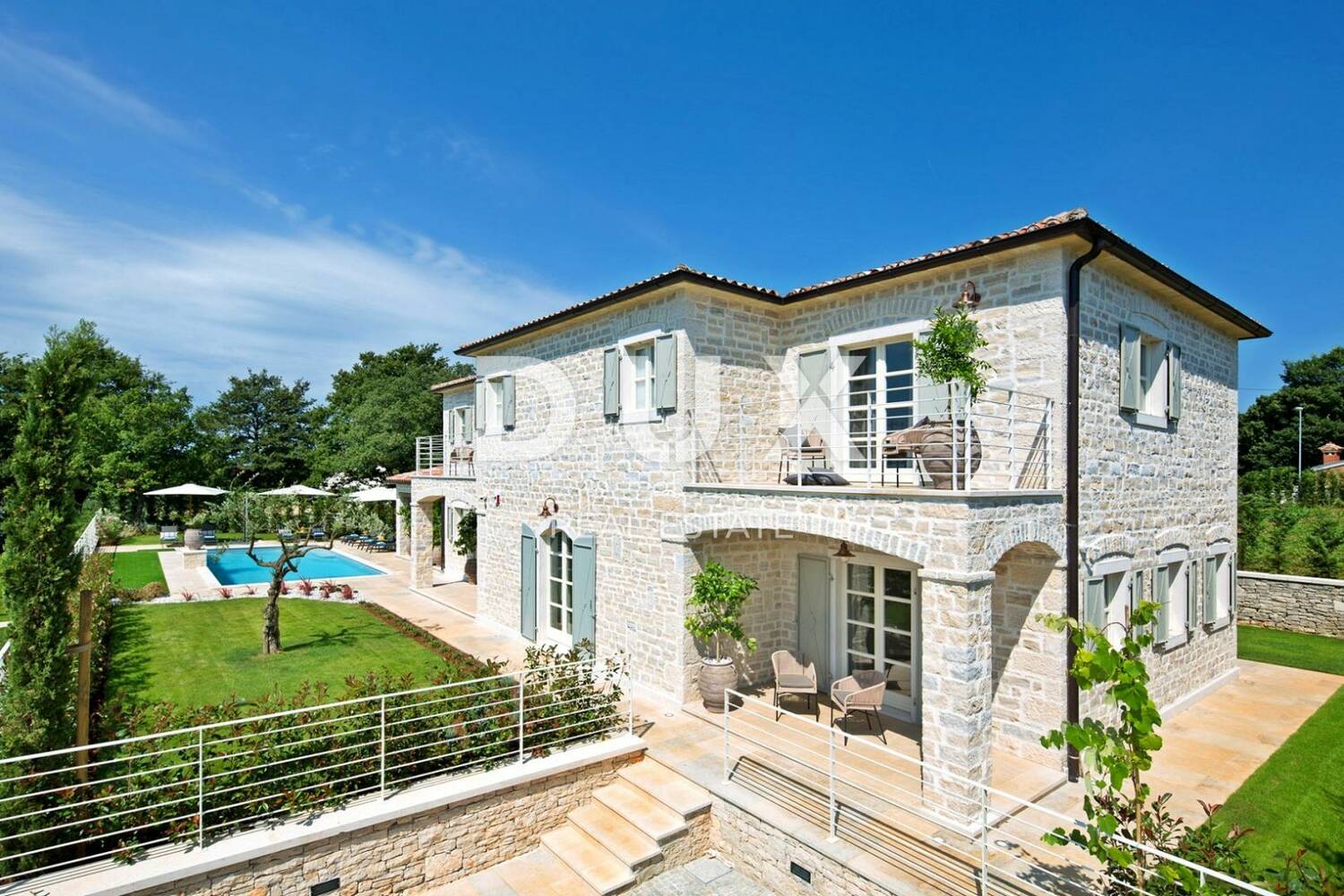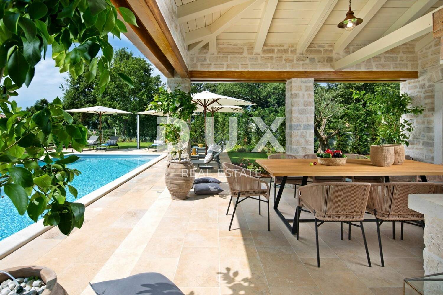 Okružena zelenilom u pitomom susjedstvu nedaleko Kanfanara, na prodaju je luksuzna kuća s bazenom.