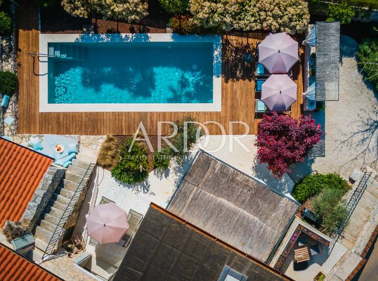 Na vanjskom prostoru nalazi se privatni grijani bazen sa slanom vodom površine 23 m², opremljen ležaljkama, suncobranima i vanjskim tušem. Natkrivena terasa s roštiljem, vanjskom kuhinjom i kamenim lounge kutkom savršena je za objedovanje na otvorenom. Ograđeni vrt s raskošnim mediteranskim biljem pruža privatnost i sigurno okruženje za obitelj.