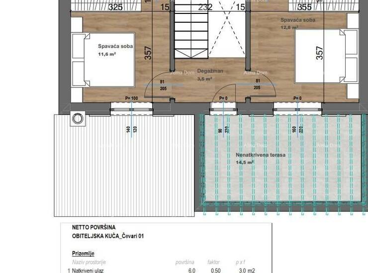 Vila, površine od 156.5 m² sastoji se od: stubišta, 2 spavaće sobe, 2 kupaonice i nenatkrivene terase.