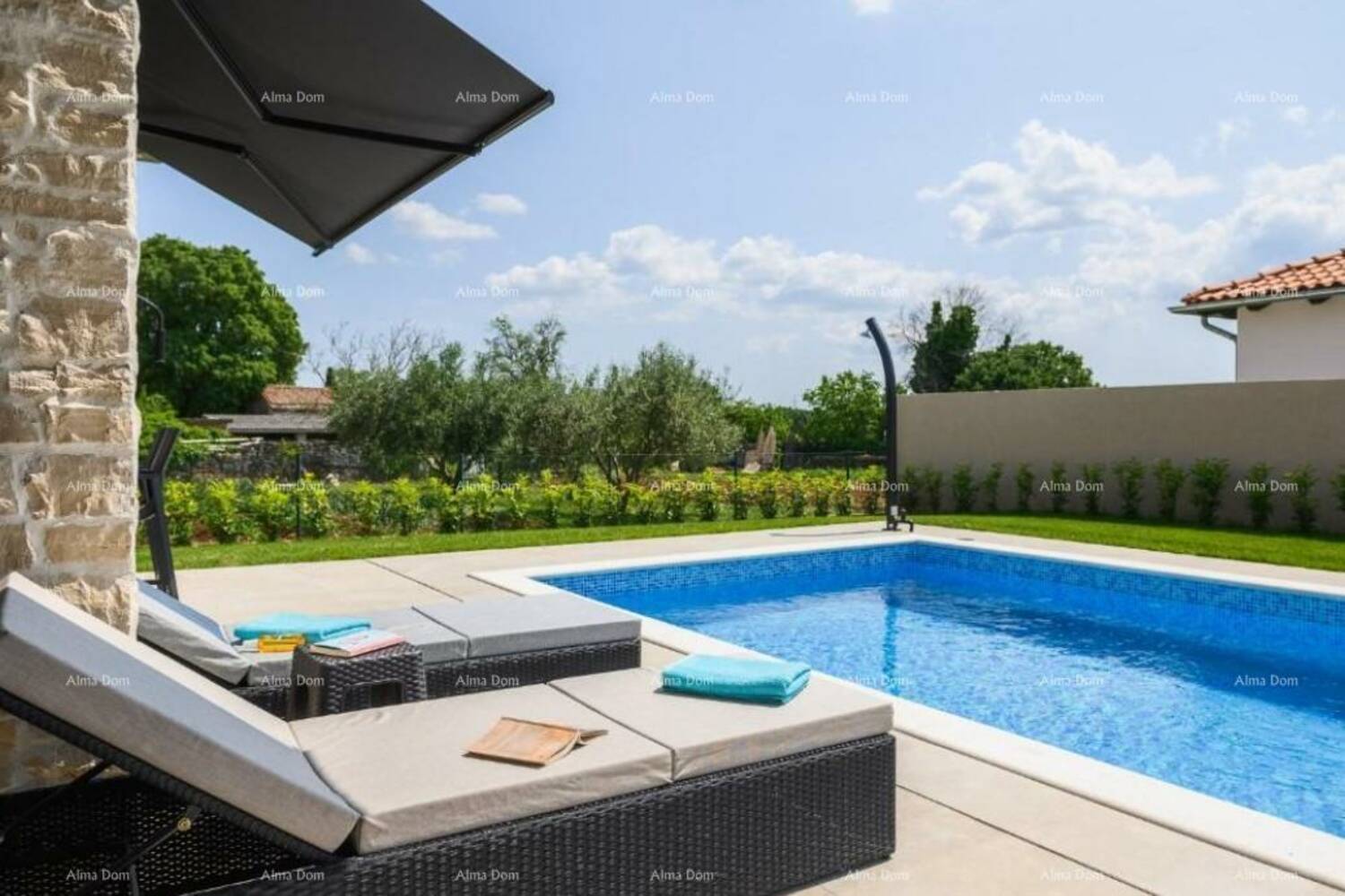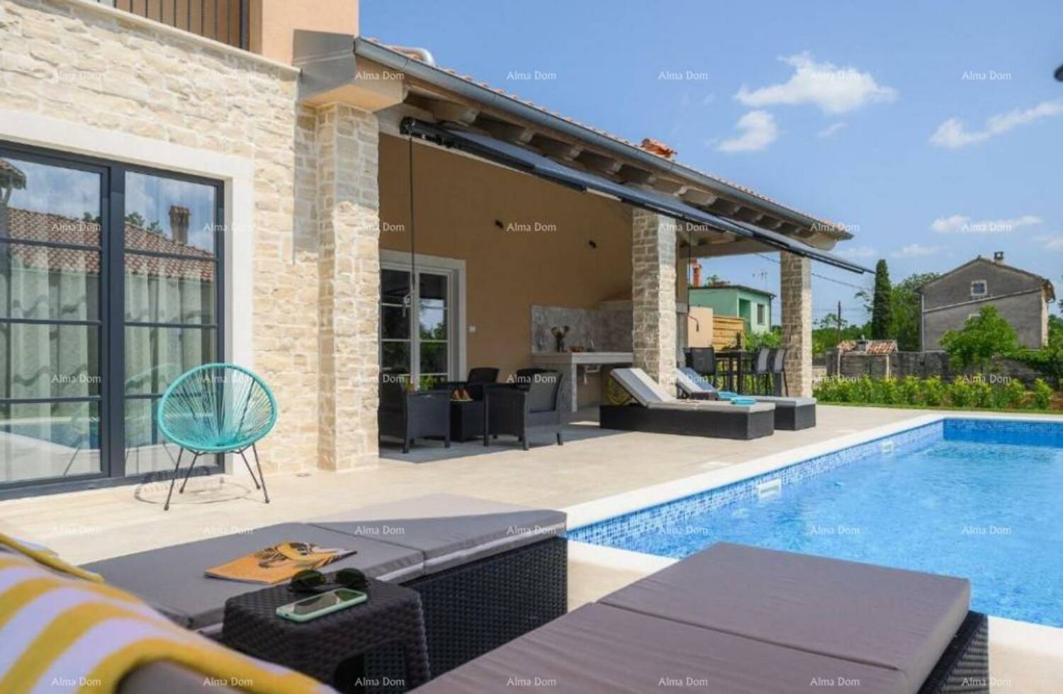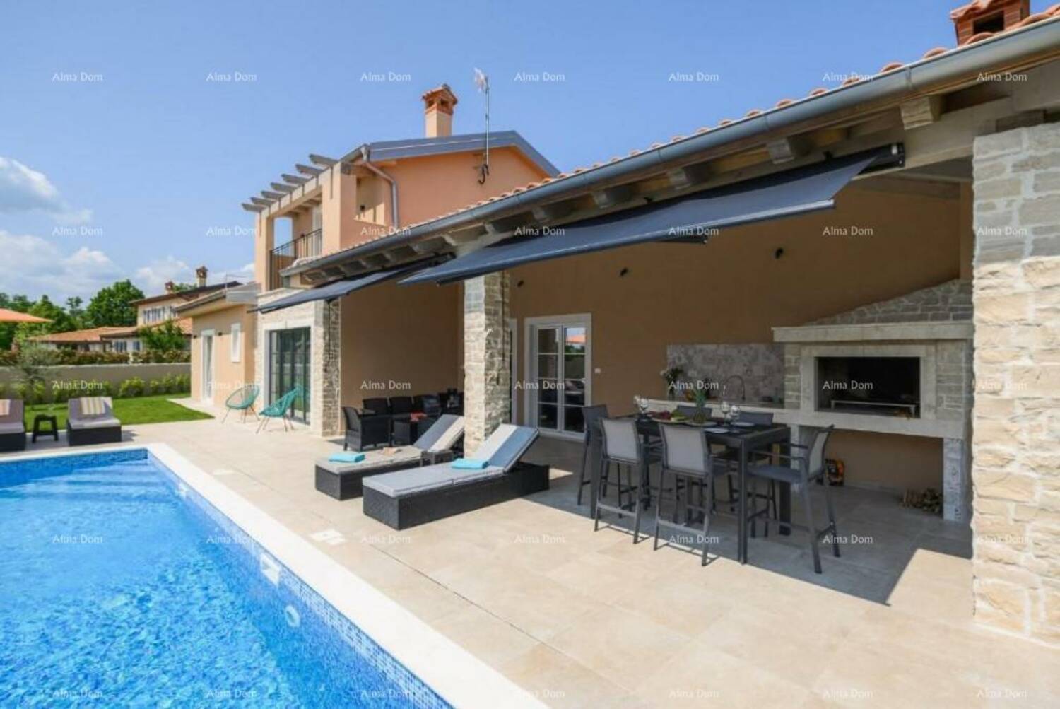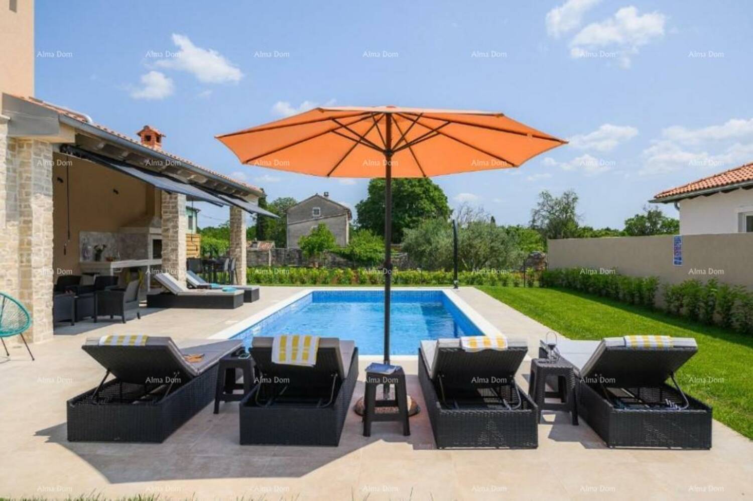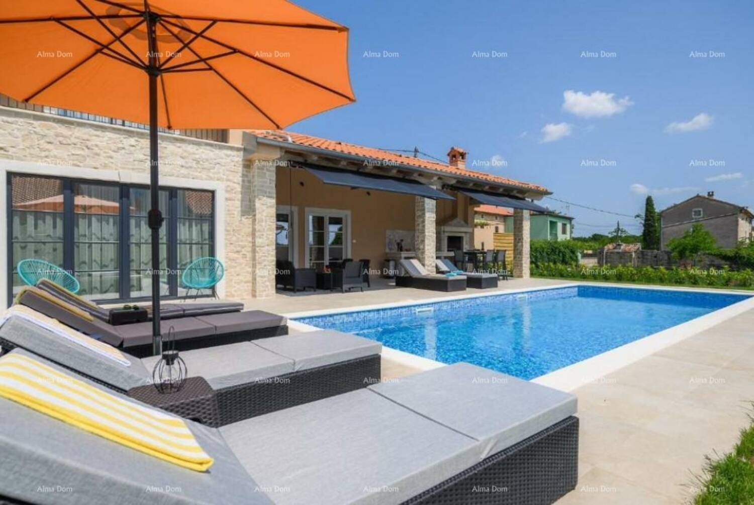 Prodaje se luksuzna moderna vila sa bazenom od 180 m2, nalazi se u malom istarskom selu, blizu Kanfanara. Ukupna površina kuće je 140 m2 stambene površine, a 40 m2 je natkrivena terasa namještena i opremljena.