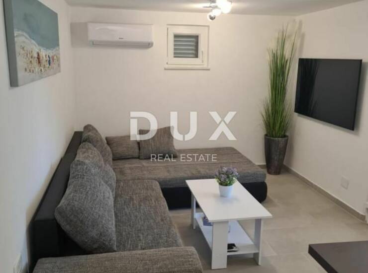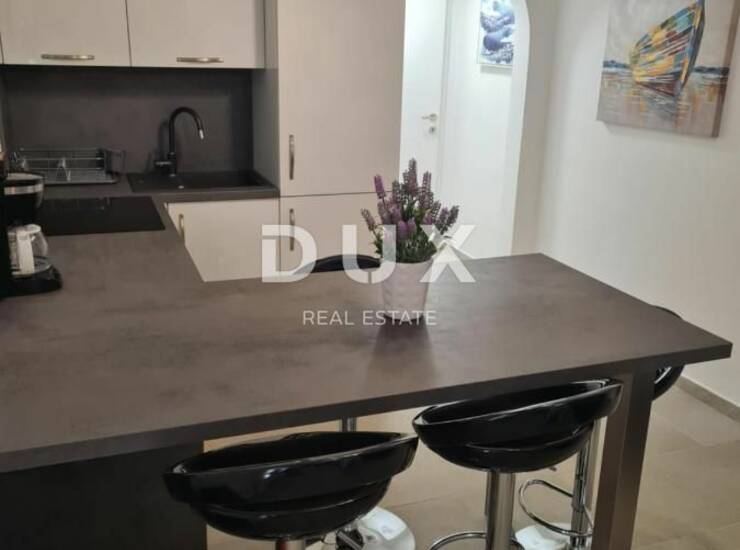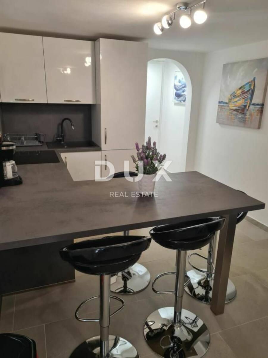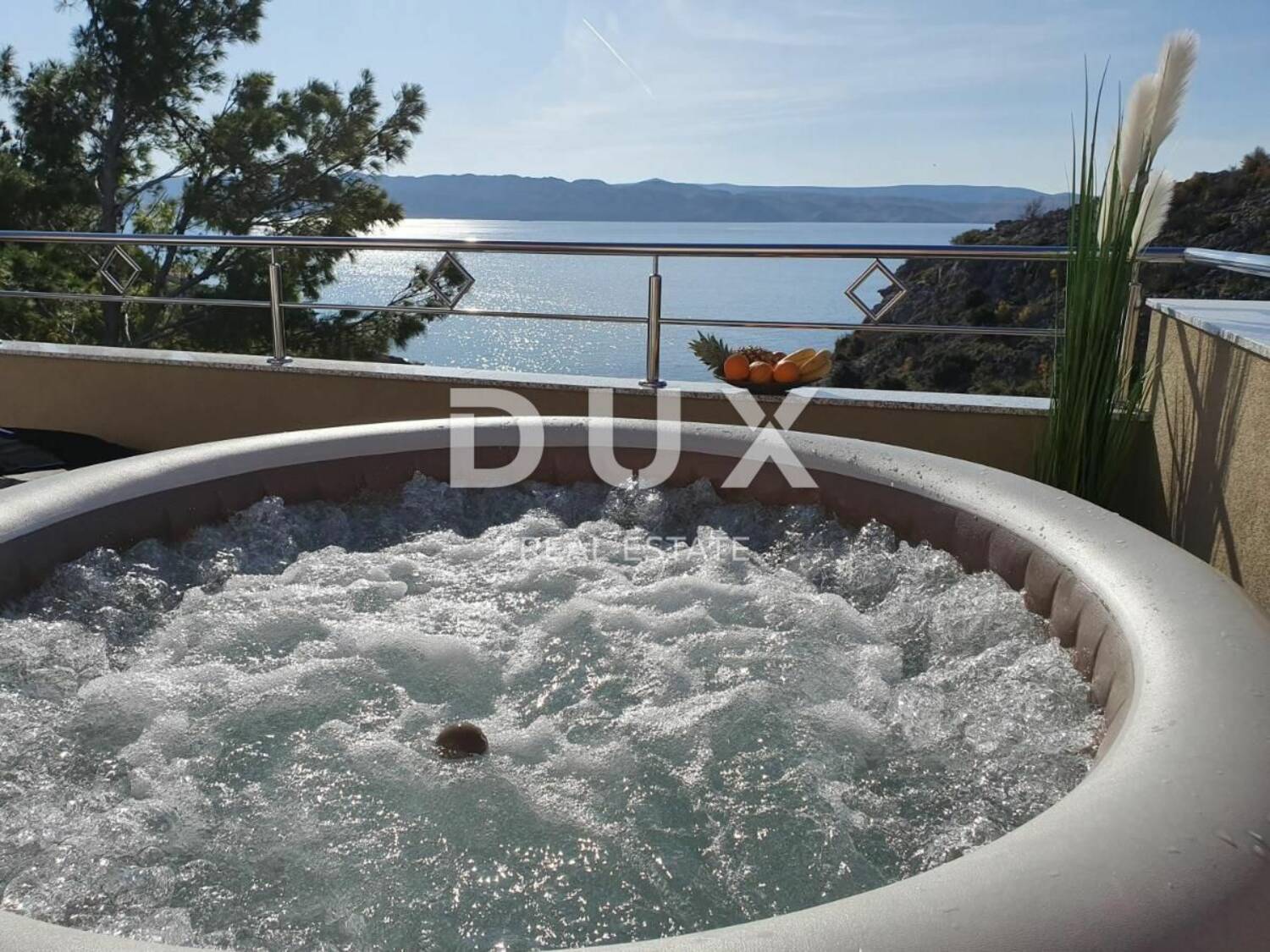 U prizemlju vile nalazi se ulaz u odvojeni apartman s jednom spavaćom sobom i kupaonicom, dodatnim WC-om, kuhinjom, blagovaonicom, dnevnim boravkom i terasom. Na prvom katu je ulaz u drugi dio vile gdje se nalazi prostrani dnevni boravak, moderno uređena kuhinja, blagovaona, predsoblje, jedna spavaća soba, kupaonica i prostrana terasa. Na drugom katu nalaze se tri spavaće sobe, kupaonica i velika terasa s jacuzzijem i pogledom na more. Sve sobe su klimatizirane i opremljene su smart televizijom. U dvorištu vile nalazi se prostrano sunčalište, veliki bazen s pripremom za grijanje i protustrujno plivanje. U dvorištu se nalazi i roštilj te parking s tri privatna parkirna mjesta.