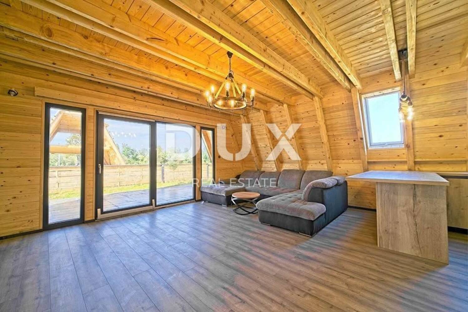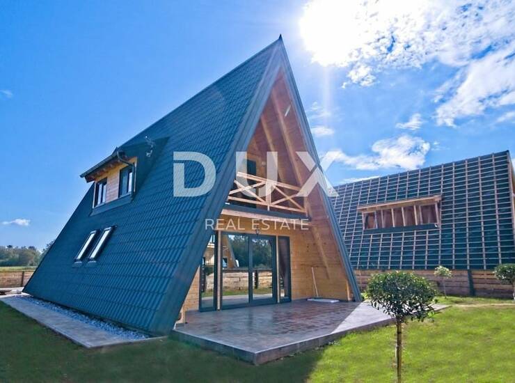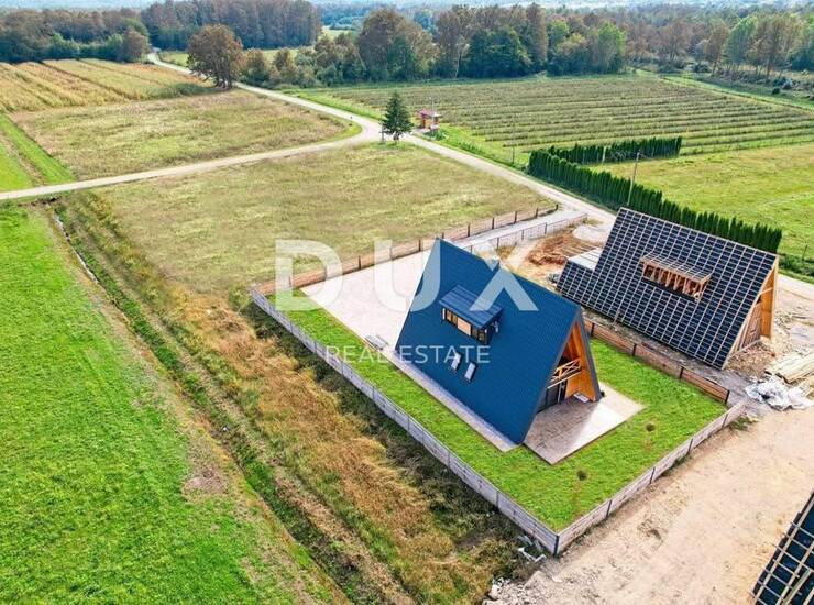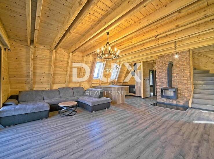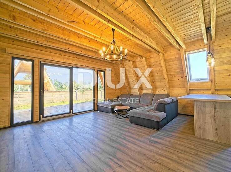 Na ograđenoj parceli od skoro 900 m² smještena je kvalitetno građena i kompletno izolirana drvena kuća površine 120 m². Topli interijer uređen je s pažnjom prema detaljima – spoj tradicionalnog i modernog stila stvara jedinstven ambijent za svakodnevni život ili odmor. Prostrani dnevni boravak s centralnim kaminom poziva na opuštanje, dok podno grijanje i klima uređaj osiguravaju udobnost kroz sve godišnje sezone.