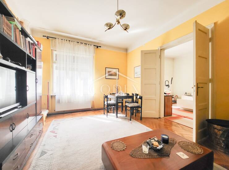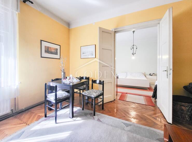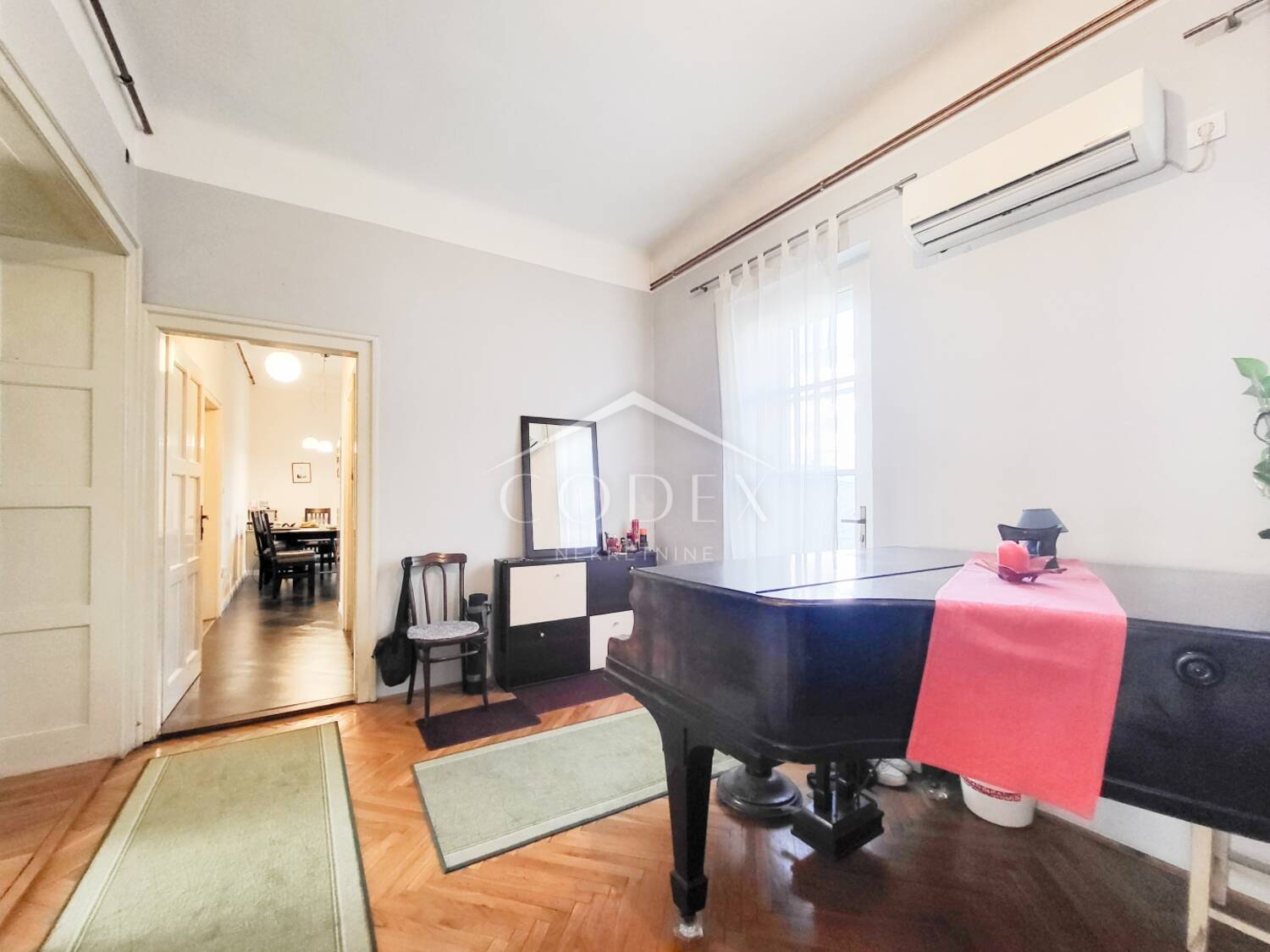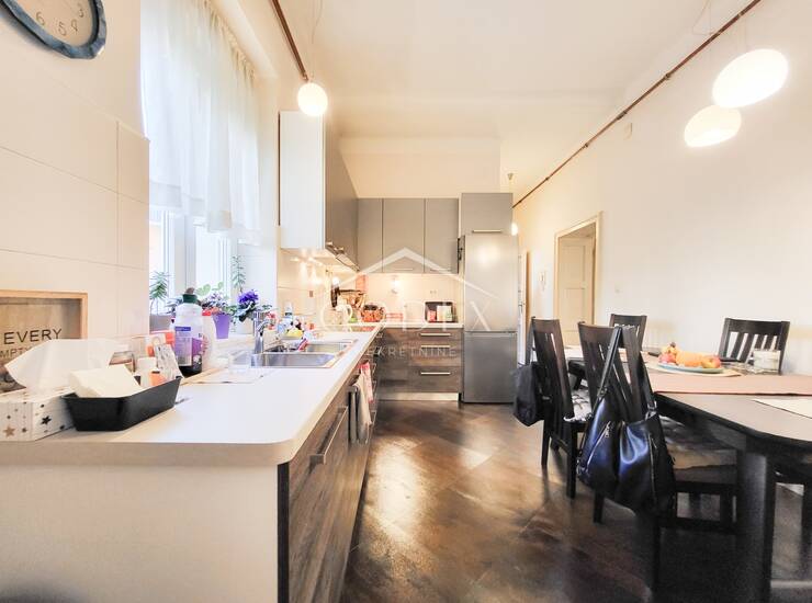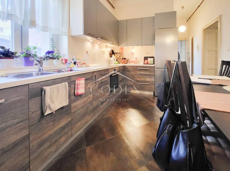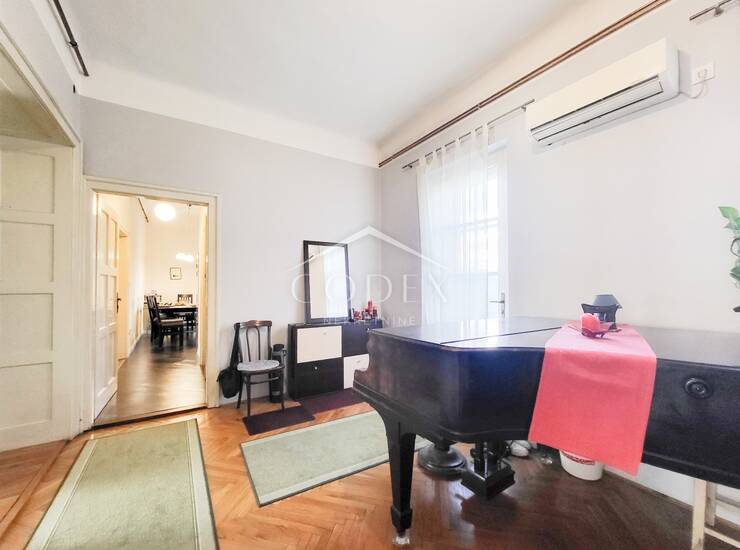 Prostrani stan odiše stilom, kvalitetom i udobnošću. Masivna drvena vrata i štokovi, hrastovi parketi, stilske kalijeve peći kao i visoki stropovi pridonose šarmu nekretnine.