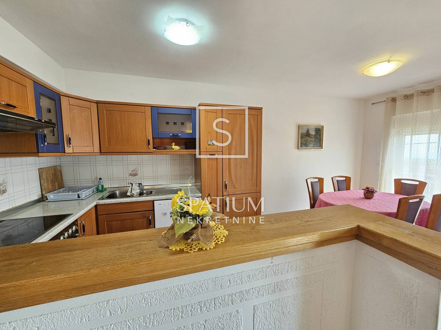 Stan u prizemlju, površine 124 m², obuhvaća ulaznu verandu, vešeraj, kuhinju s dnevnim boravkom i izlazom na veliku terasu s otvorenim pogledom na more, hodnik, dvije spavaće sobe, kupaonicu te zaseban toalet za goste.