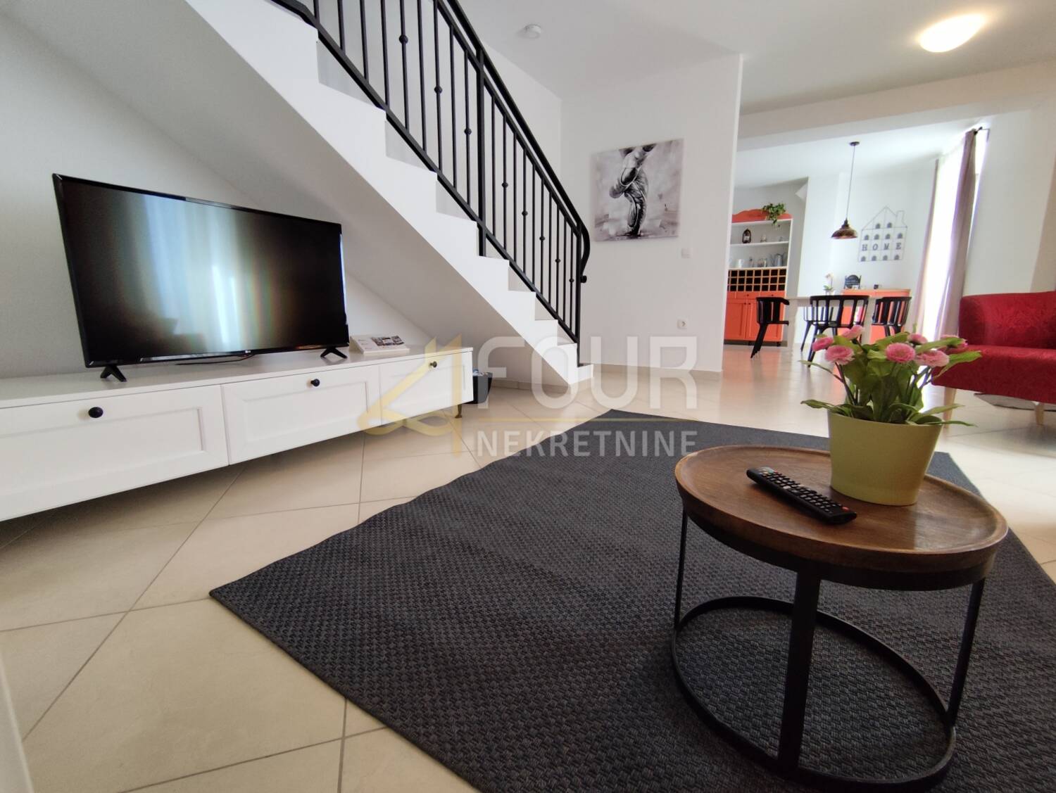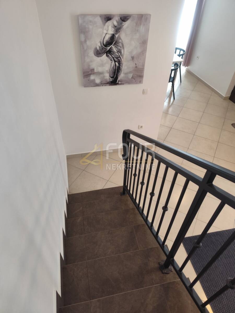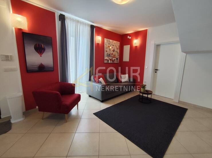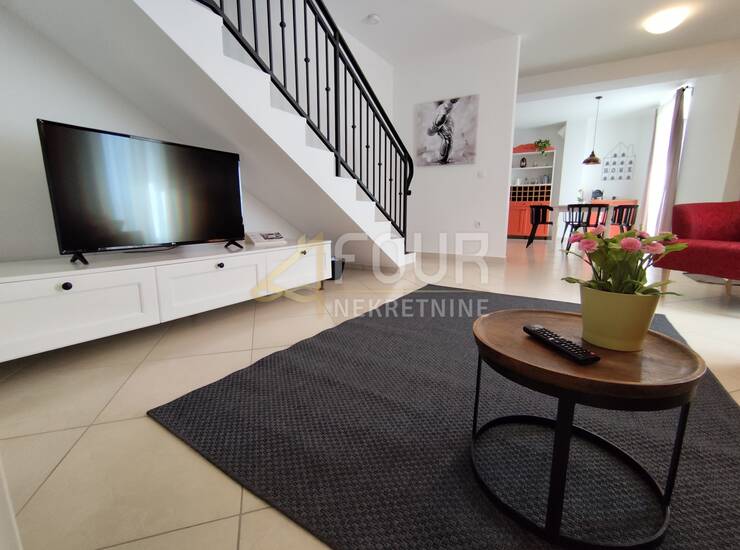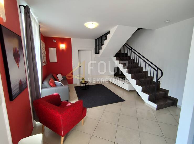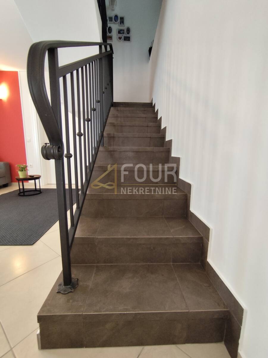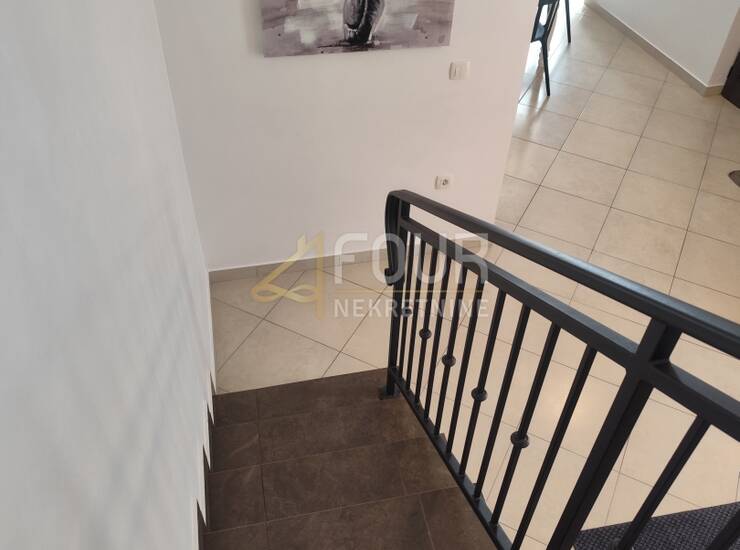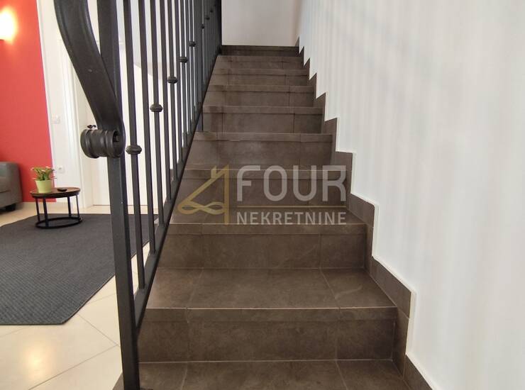 Prostrani dnevni boravak s kuhinjom u open space konceptu i elegantnim stepenicama vodi na kat gdje se nalaze dvije velike spavaće sobe, svaka s vlastitom kupaonicom, predsoblje i velika terasa. Prizemlje nudi dodatnu spavaću sobu, kupaonicu, igraonicu i vešeraj s izlazom na veliku terasu s jacuzzijem, idealnu za opuštanje i druženje.