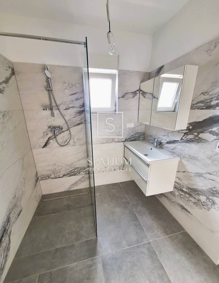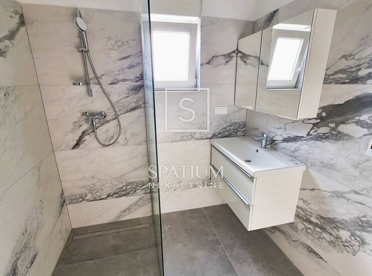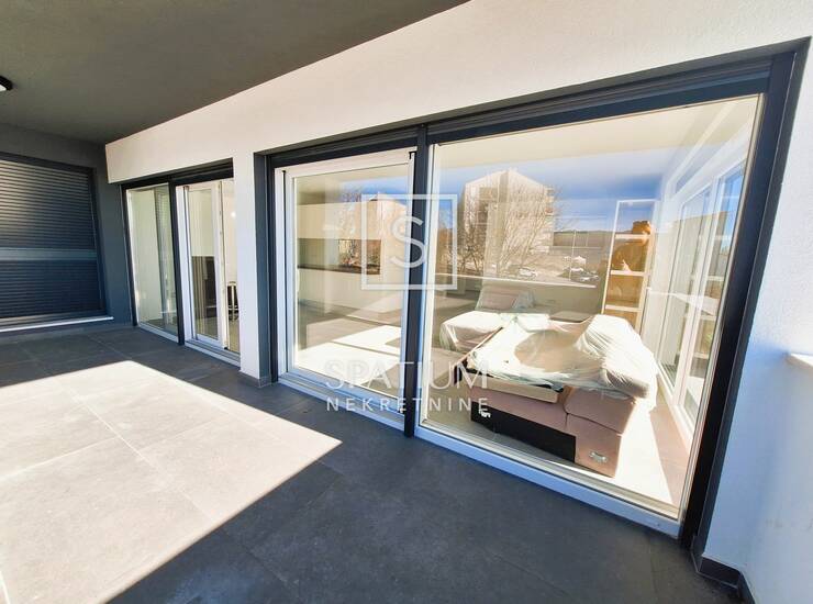 REŠETARI, u ponudi imamo prostrani stan u novogradnji od 105,12m2. Sastoji se od kuhinje s blagovaonicom i dnevnim boravkom, dva hodnika, toaleta, vešeraja, tri sobe i dvije kupaonice, te balkona od 18m2. Pripadaju mu dva vanjska parkirna mjesta i garaža od 18,40m2. Potpuno opremljen. Grijanje podno putem dizalica topline. Nalazi se u manjoj zgradi sa zasebnim ulazom.