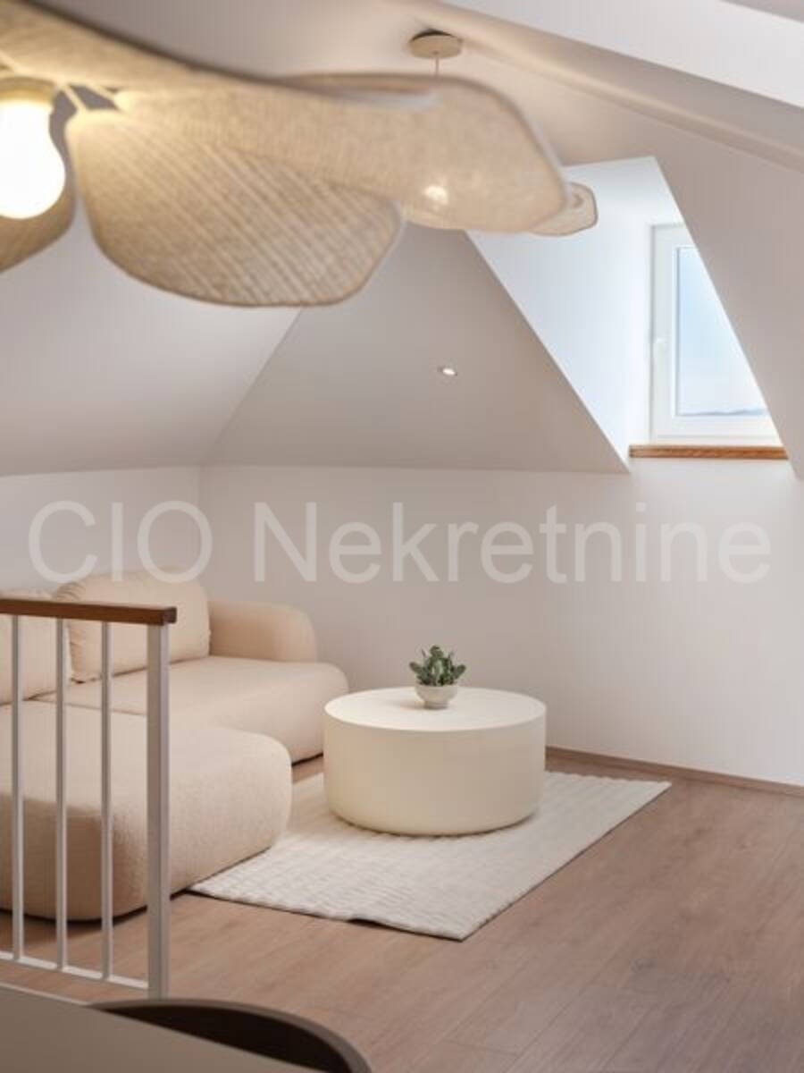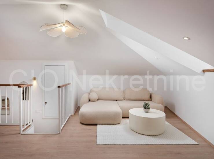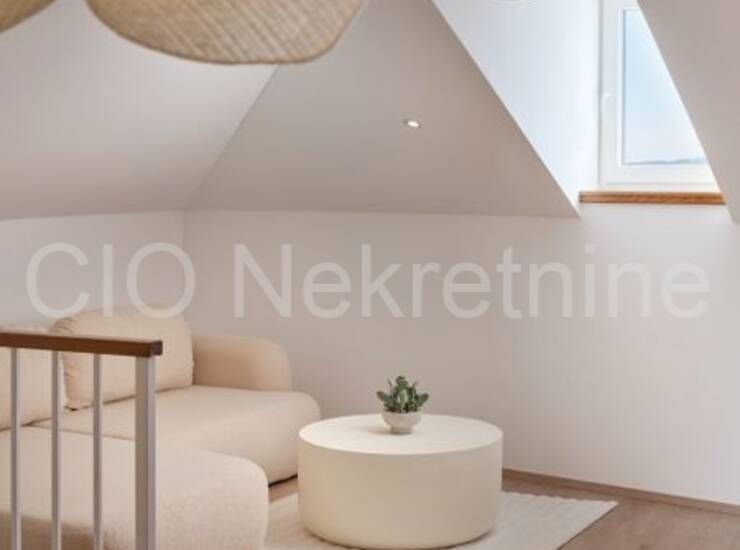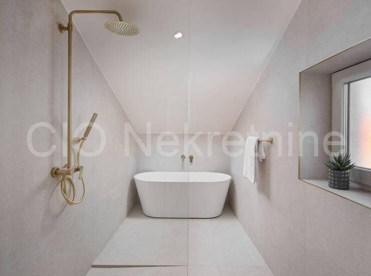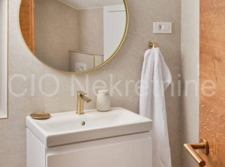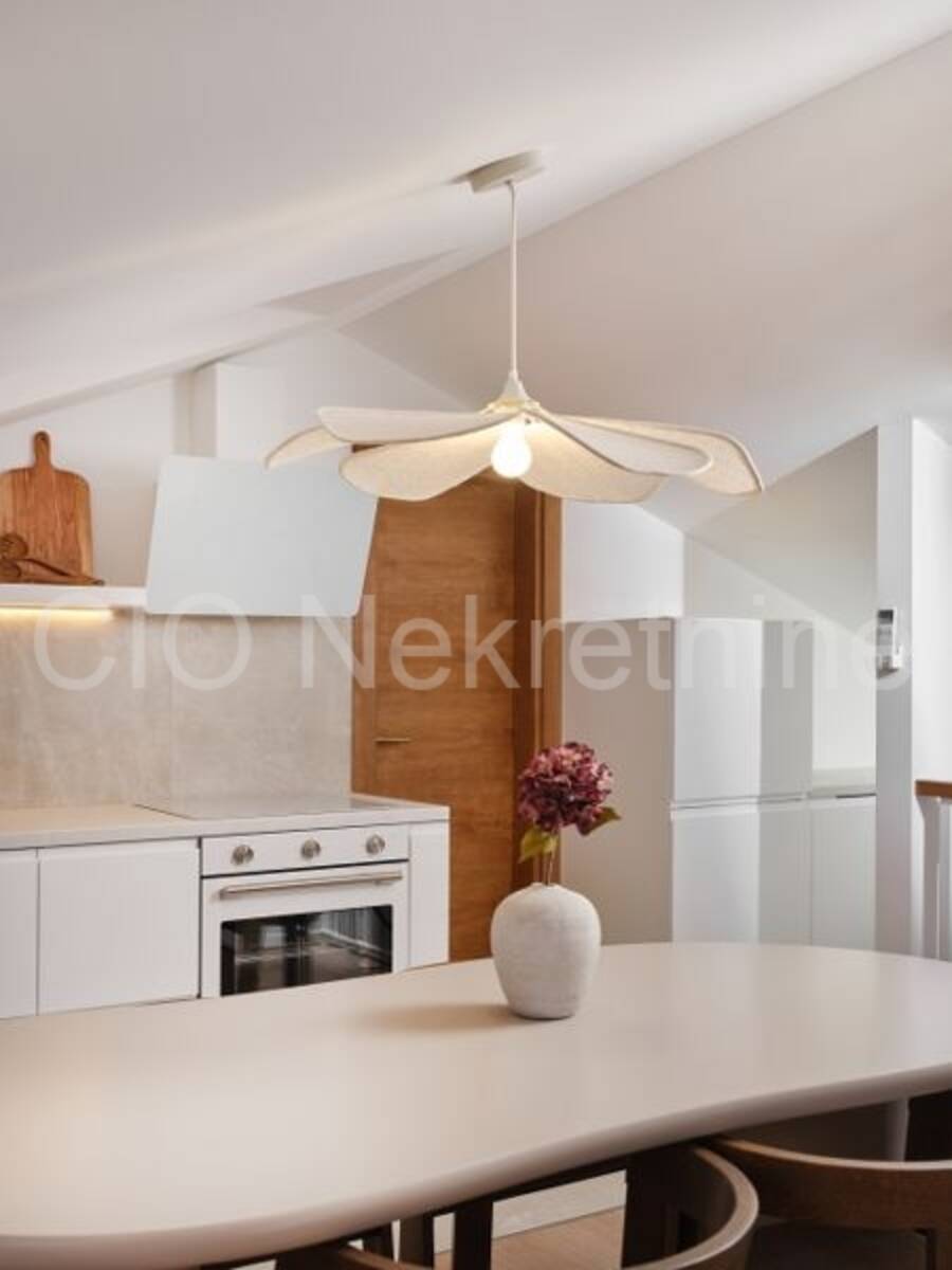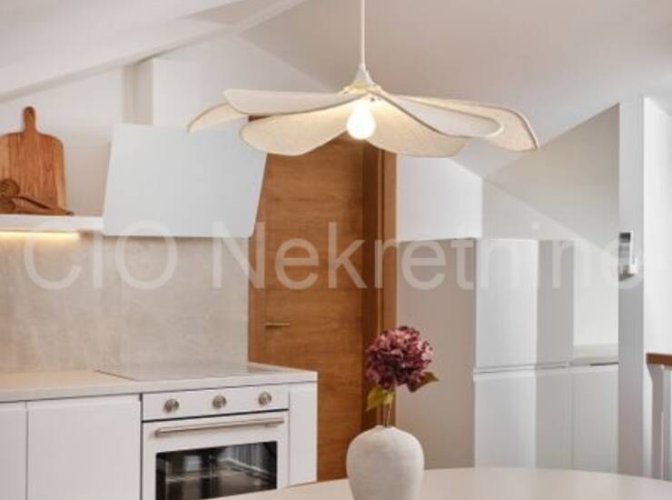 Interijer odiše elegancijom i obiljem prirodnog svjetla, a kuća je potpuno dizajnerski uređena i spremna za useljenje ili turistički najam. Opremljena je podnim grijanjem, klima uređajima u svim prostorijama, modernom rasvjetom i parlafonom na svakoj etaži.