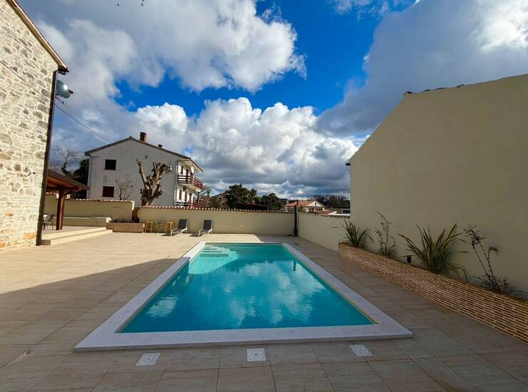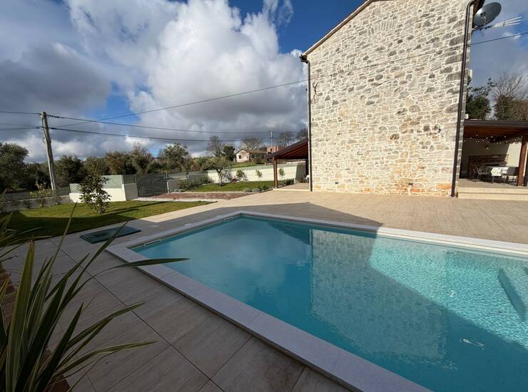 U mirnom i slikovitom mjestu u okolici Poreča, udaljenom svega 12 km od Poreča i 8 km od mora, prodaje se prekrasna autohtona istarska kamena kuća s bazenom. Kuća se nalazi u mjestu sa svim potrebnim sadržajima za svakodnevni život – u blizini su trgovina, pošta, restorani, kafići i ostali korisni sadržaji. Ova dvojna kuća prostire se na tri etaže, ukupne površine cca 110 m². U prizemlju se nalazi prostrani dnevni boravak s kuhinjom i blagovaonicom u otvorenom konceptu, dodatni WC te izlaz na natkrivenu terasu. Na prvom i drugom katu smještene su dvije velike spavaće sobe, svaka s vlastitom kupaonicom. S gornjeg kata pruža se pogled na more. Kuća se prodaje potpuno renovirana i namještena te opremljena po principu “ključ u ruke”. Opremljena je električnim podnim grijanjem u cijeloj kući i klima uređajima na svakoj etaži, što omogućuje ugodan boravak tijekom cijele godine. Uređena okućnica površine cca 480 m² uključuje bazen sa sunčalištem, natkrivenu ljetnu kuhinju i prostor za roštilj – idealno za druženje na otvorenom. Ispred kuće su osigurana dva parkirna mjesta- Ova kamena kuća nudi savršen spoj istarskog šarma i moderne udobnosti te je izvrsna prilika za cjelogodišnje stanovanje ili kao investicija za turistički najam.