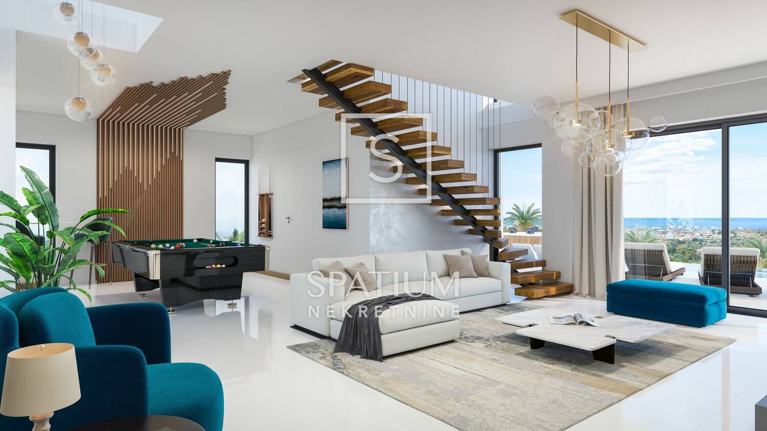 Vilu karakteriziraju čiste linije, otvoreni prostori i snažna povezanost interijera s vanjskim okruženjem. Velike staklene stijene osiguravaju obilje prirodnog svjetla i stvaraju osjećaj prostranosti, dok krovni otvori postavljeni duž cijelog stubišta omogućuju dodatno dnevno osvjetljenje te pogled na nebo i zvijezde u noćnim satima.