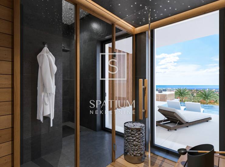 Središnji vanjski element vile je infinity bazen, s jednim bočnim zidom izvedenim u prozirnom staklu, čime se postiže atraktivan vizualni efekt i dojam spajanja vode s horizontom. Uz bazen se nalazi fire pit, odvojen staklenom pregradom, koji dodatno naglašava luksuzan karakter eksterijera. U sklopu wellness sadržaja predviđena je sauna s pogledom na nebo te vanjski jacuzzi.