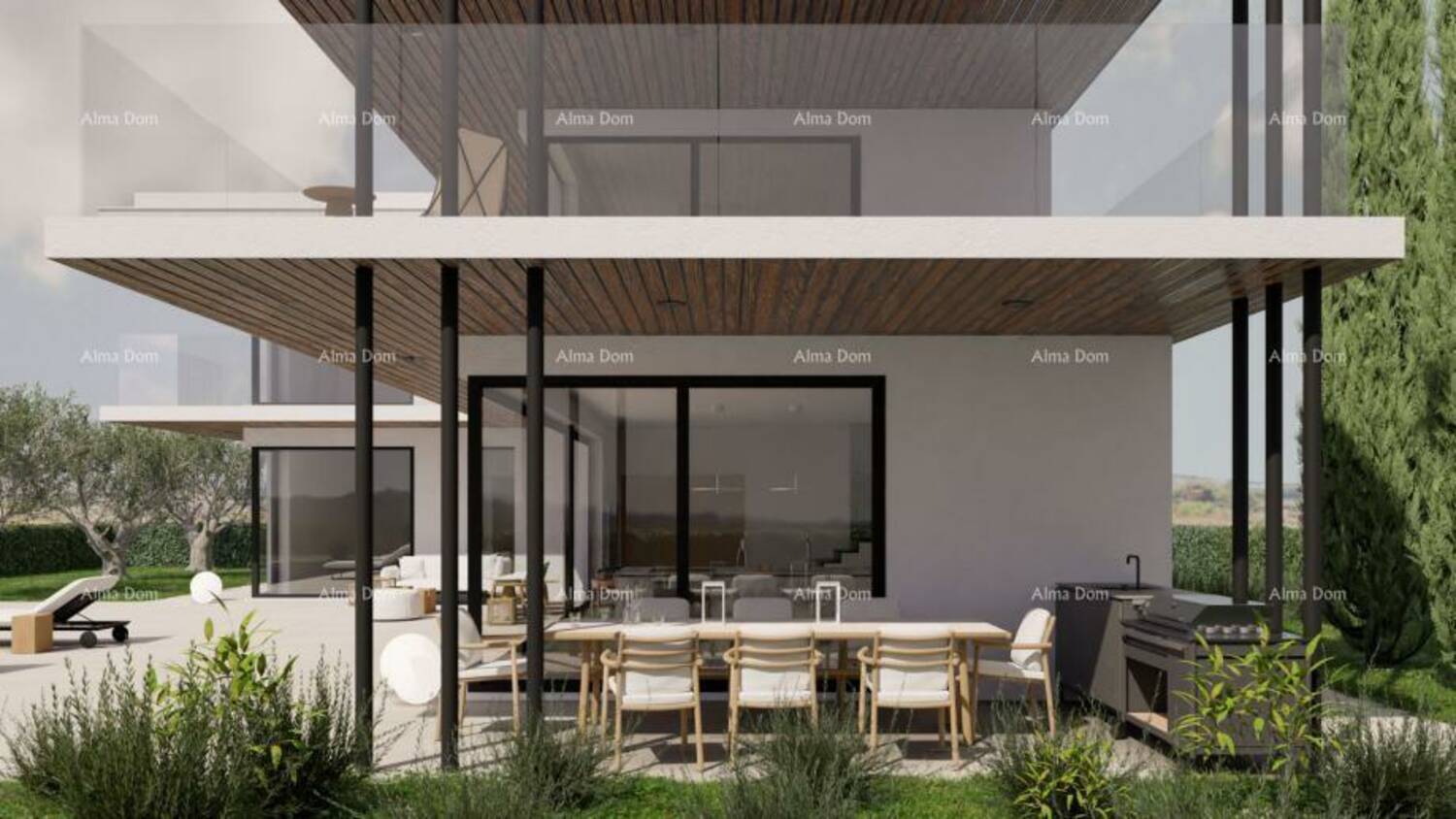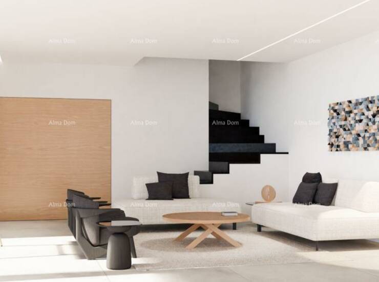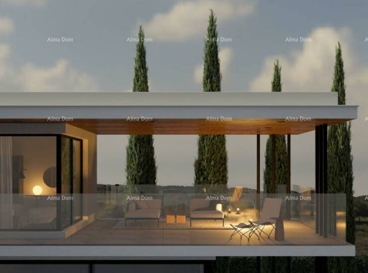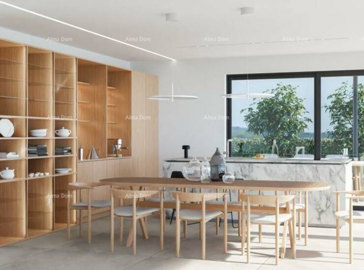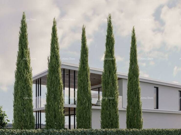 Na prodaju je prestižna samostojeća vila smještena u mirnom naselju Kaštelir, svega 10 kilometara od Poreča i mora. Vila je izgrađena na prostranoj parceli od 971 m², okružena mediteranskim vrtom, impresivnim pinijama visine 5 metara, te elegantno uređenim sunčalištem i terasom uz bazen.
