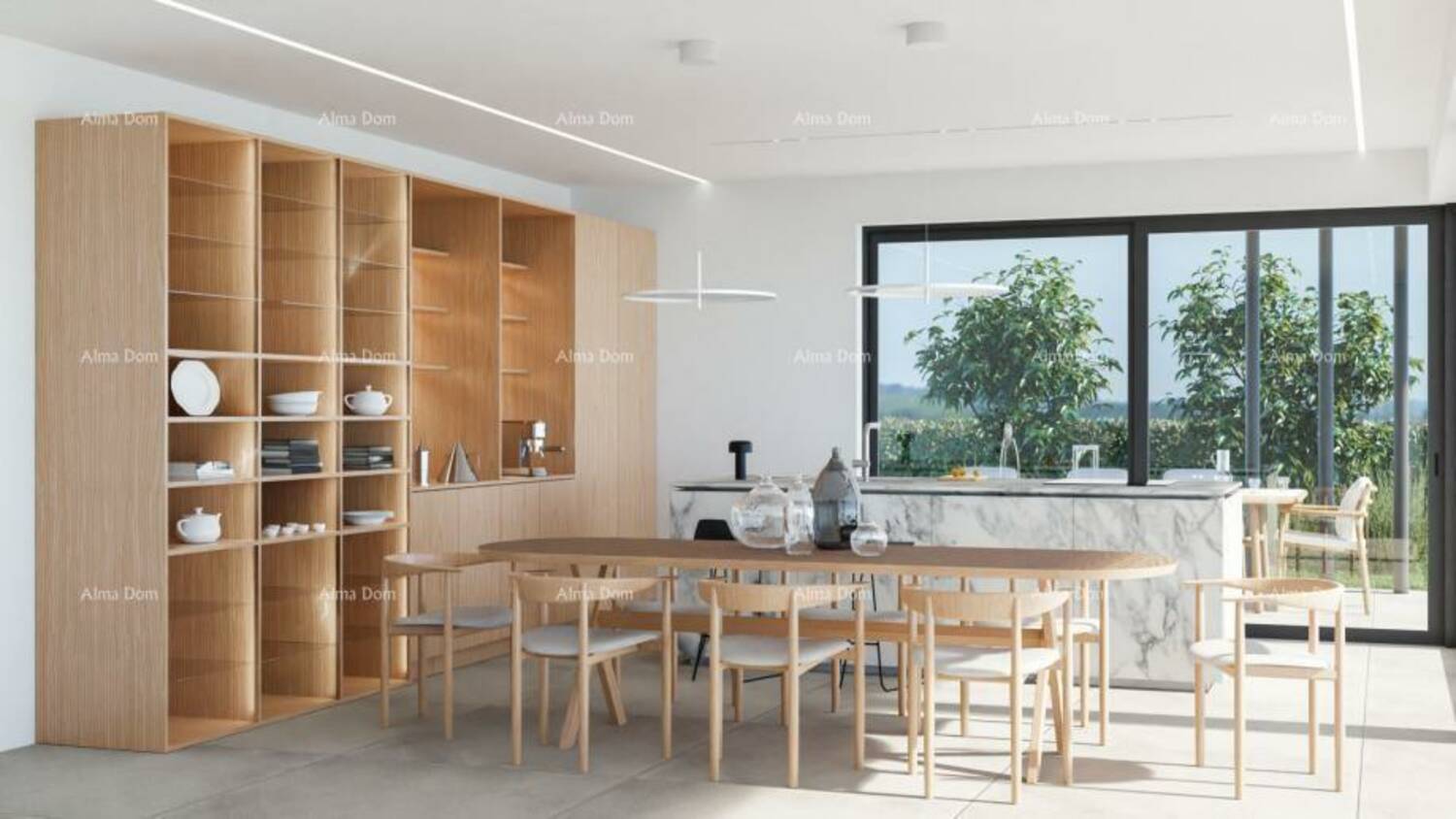 Prostrani open space dnevni boravak, kuhinja i blagovaonica (50 m²) s velikim staklenim stijenama koje povezuju interijer s vanjskom terasom i bazenom,
