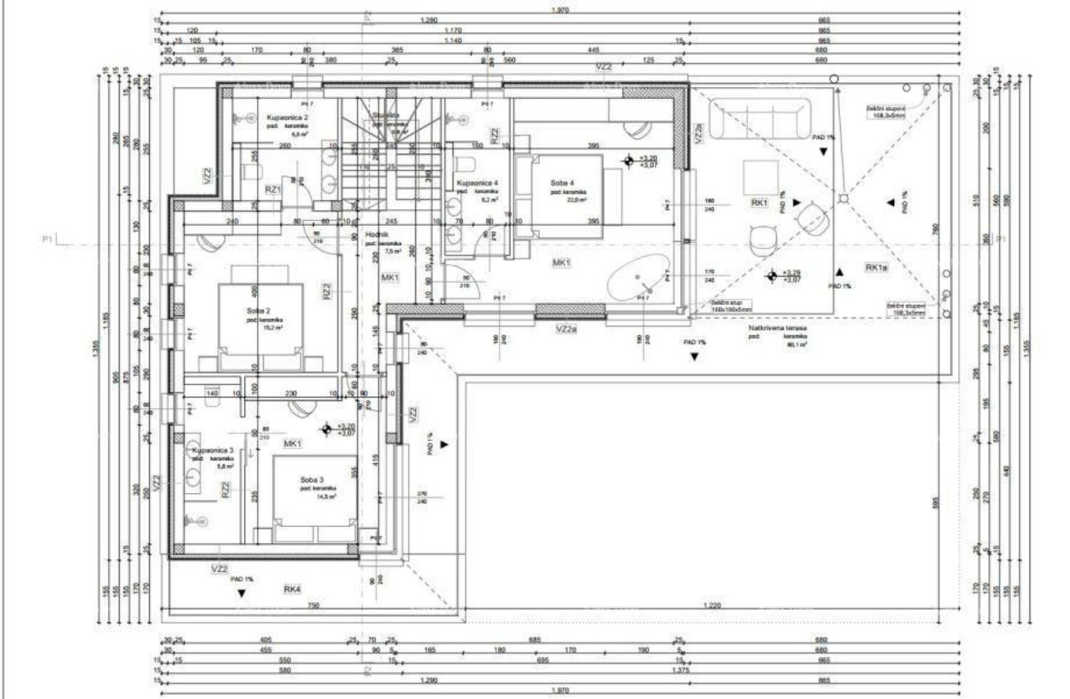 Ukupna neto površina kuće iznosi 330,50 m², a prostire se na dvije etaže.