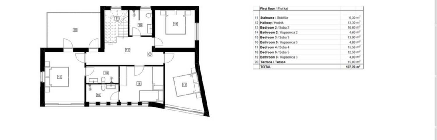 Prvi kat nudi pažljivo osmišljen raspored s četiri prostrane spavaće sobe, svaka s puno prirodnog svjetla i pogleda. Glavna spavaća soba (15,90 m²) ima vlastitu kupaonicu (4,80 m²). Dvije dodatne kupaonice služe ostalim spavaćim sobama. Na ovom katu nalazi se i velika terasa (16,80 m²), idealna za opuštanje i uživanje u panoramskom pogledu.