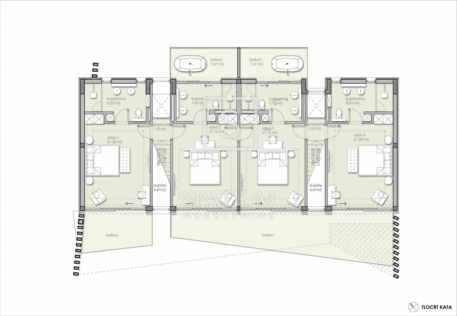 Projektom je predviđena izgradnja reprezentativne vile suvremenog dizajna, s pogledom na more već iz prizemlja i prostora bazena. Vila je osmišljena kao luksuzna rezidencija s ukupnom neto površinom s uključenim koeficijentima od 327 m², odnosno 467 m² neto stambene površine s balkonima te natkrivenim i nenatkrivenim terasama. Poseban naglasak stavljen je na komfor i privatnost, uz četiri prostrane spavaće sobe, svaku s vlastito