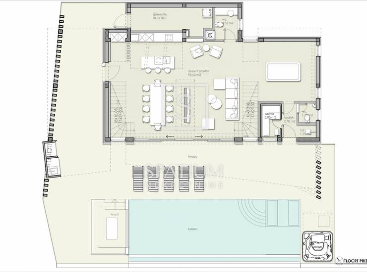 Projektom je predviđena izgradnja reprezentativne vile suvremenog dizajna, s pogledom na more već iz prizemlja i prostora bazena. Vila je osmišljena kao luksuzna rezidencija s ukupnom neto površinom s uključenim koeficijentima od 327 m², odnosno 467 m² neto stambene površine s balkonima te natkrivenim i nenatkrivenim terasama. Poseban naglasak stavljen je na komfor i privatnost, uz četiri prostrane spavaće sobe, svaku s vlastito