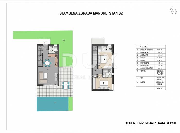 Stan S-2 koncipiran kao dvoetažni stan sveukupne stambene površine od 94,30m2, koji se sastoji od ulaznog hodnika, kupatila, open space dnevnog djela s kuhinjom i blagovaonicom s izlazom na terasu s bazenom i vlastitom okućnicom-vrtom na donjoj etaži. Na katu nalazimo dvije spavaće sobe od kojih svaka ima vlastito kupatilo.