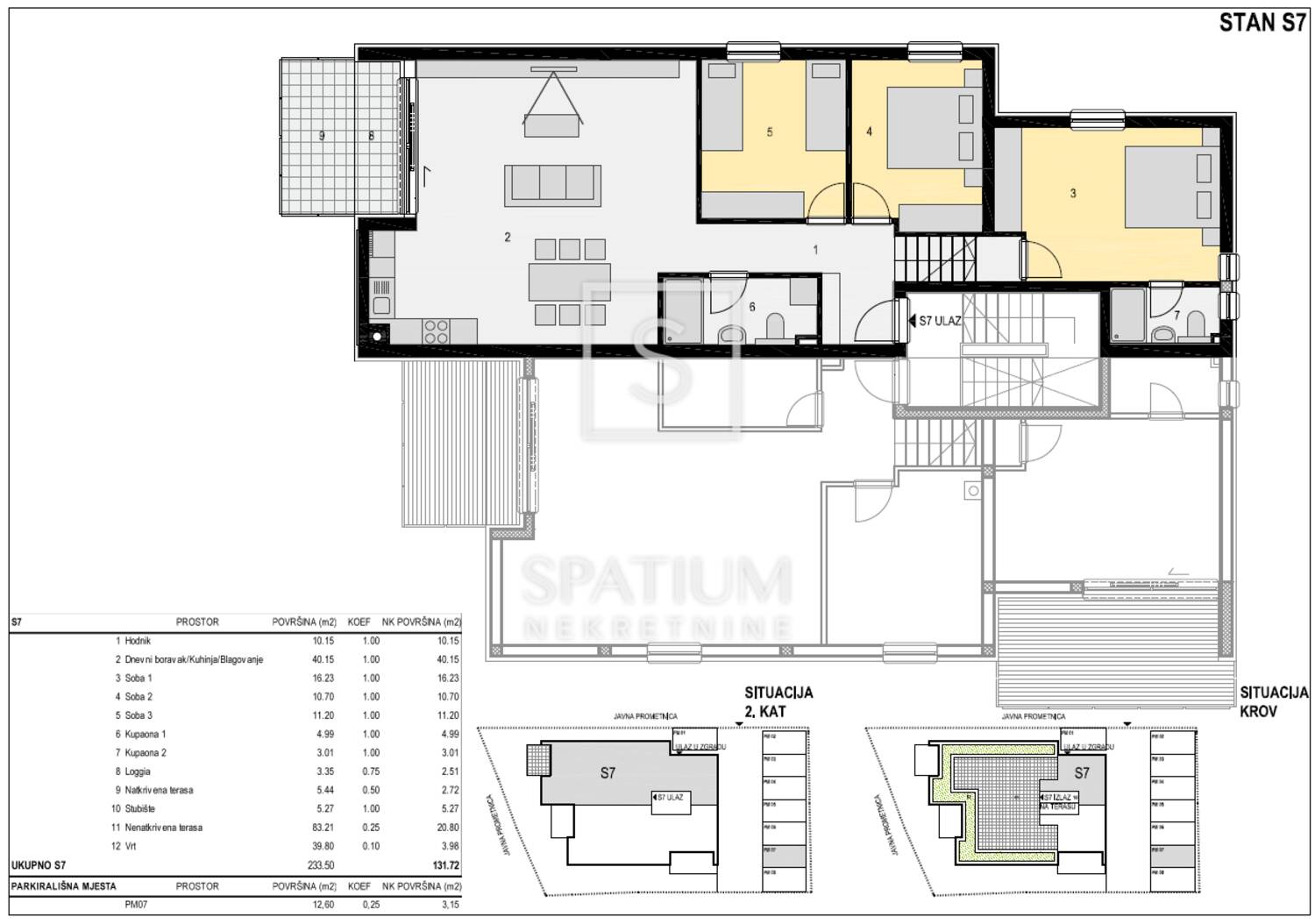 Stan se sastoji od tri prostrane spavaće sobe, dvije kupaonice s podnim grijanjem te prozračnog dnevnog prostora koji objedinjuje kuhinju, blagovaonicu i dnevni boravak. Iz dnevnog dijela izlazi se na natkrivenu terasu s koje se pruža impresivan pogled na more. Stan ima dodatnu privatnu krovnu terasu.