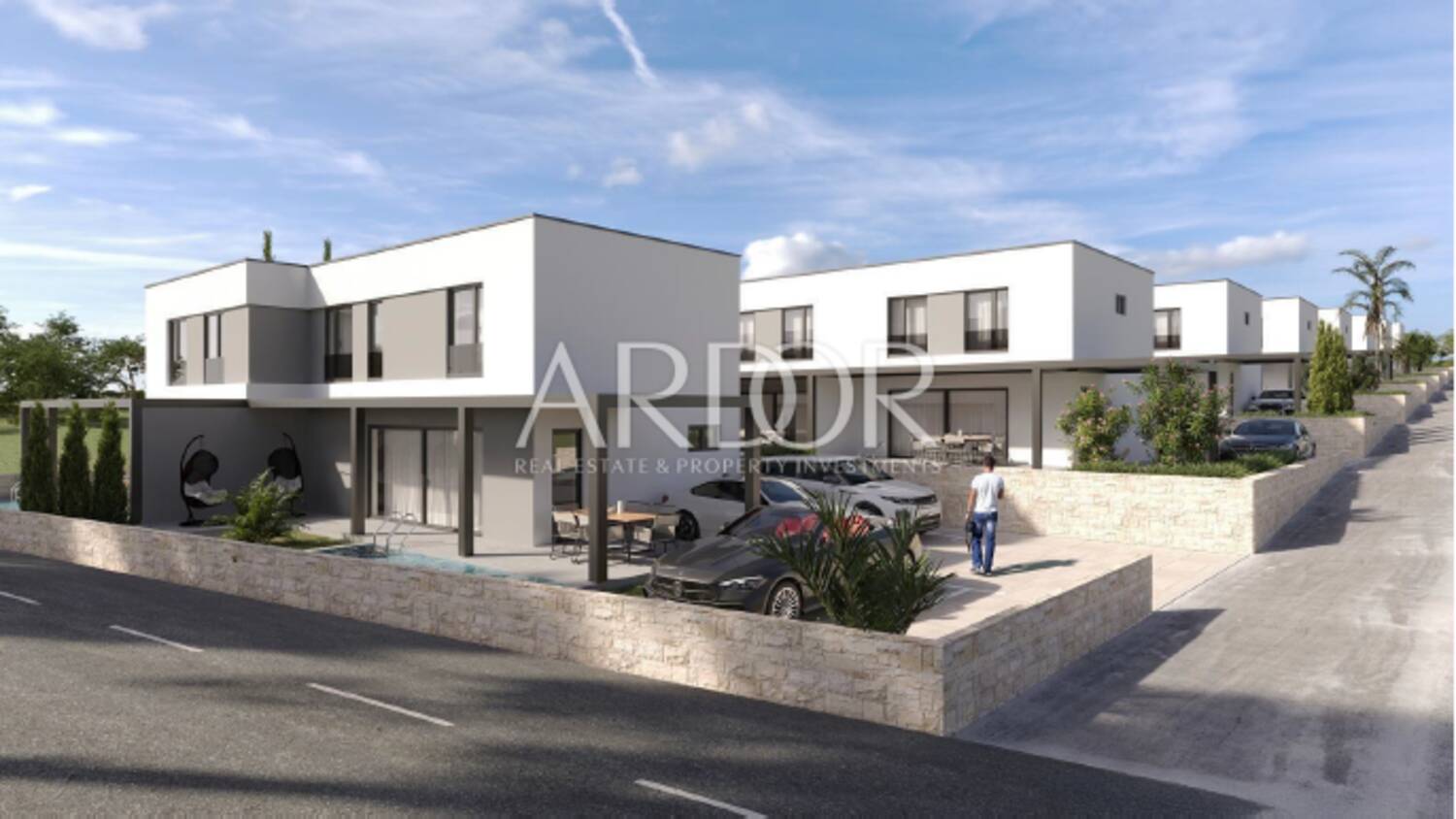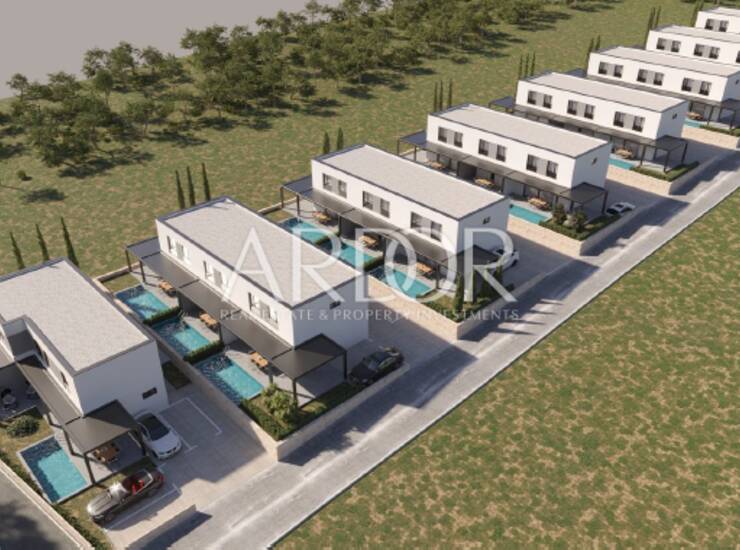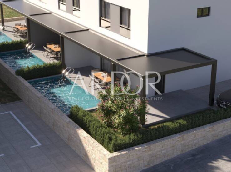 Nekretnina uključuje dva vanjska nenatkrivena parkirna mjesta ukupne površine 25 m². Ulazna vrata su visokokvalitetna, izrađena od višekomornih profila, dok je unutarnja stolarija modernog dizajna i vrhunske izrade. Podne obloge čine keramičke pločice A klase velikog formata, koje dodatno naglašavaju suvremeni karakter prostora.