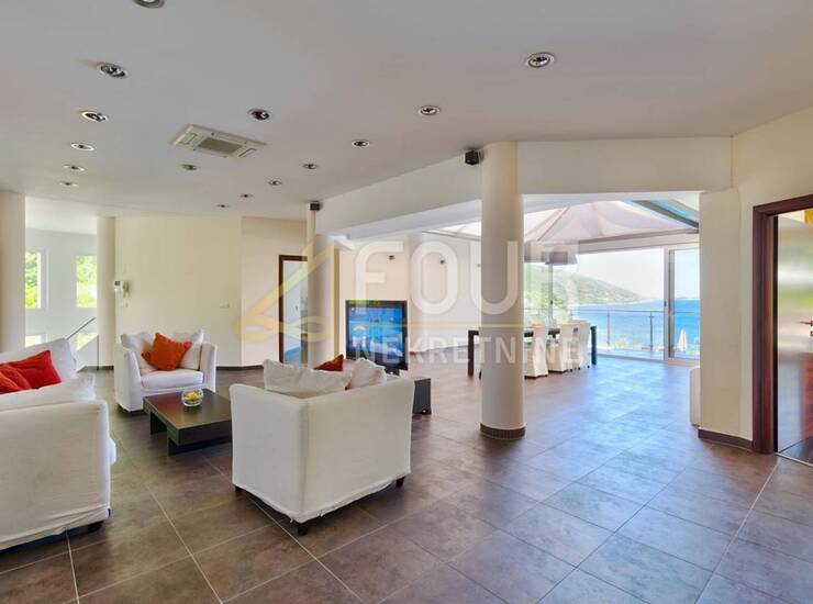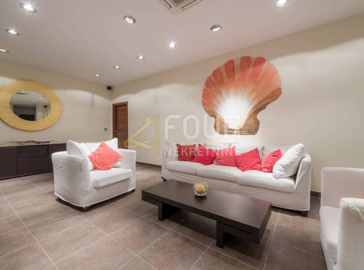 Prostire se na dva kata s ukupno 520 m2 prostora i prostranom okućnicom koja uključuje vrtove, bazen i terase. Unutrašnjost odiše elegancijom i funkcionalnošću – prostrani dnevni boravak i blagovaonica, potpuno opremljena kuhinja, klimatizirani prostori s podnim grijanjem te raskošne spavaće sobe s vlastitim kupaonicama stvaraju atmosferu privatnog luksuznog resorta.