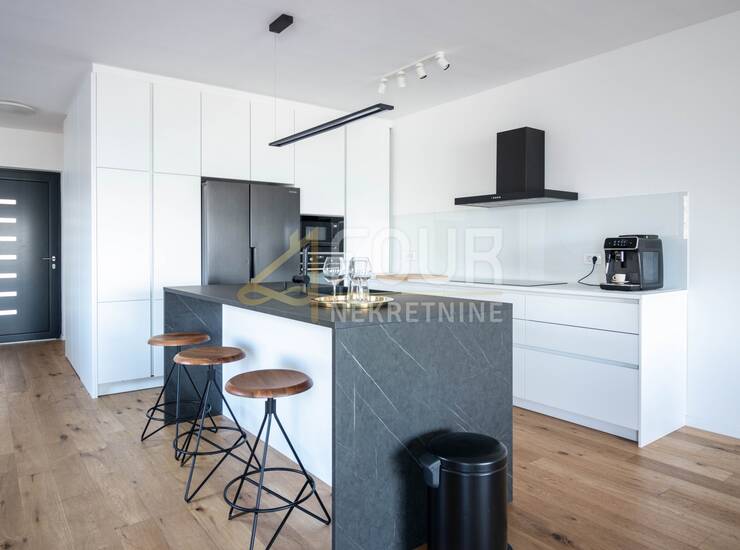 Interijer je uređen s naglaskom na kvalitetu i estetiku, uz podno grijanje na dizalicu topline, vrhunske podne obloge te namještaj rađen po mjeri koji je uključen u cijenu. Dodatnu sigurnost i komfor osigurava sustav videonadzora, dok južna orijentacija garantira obilje prirodnog svjetla tijekom cijelog dana.