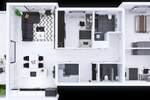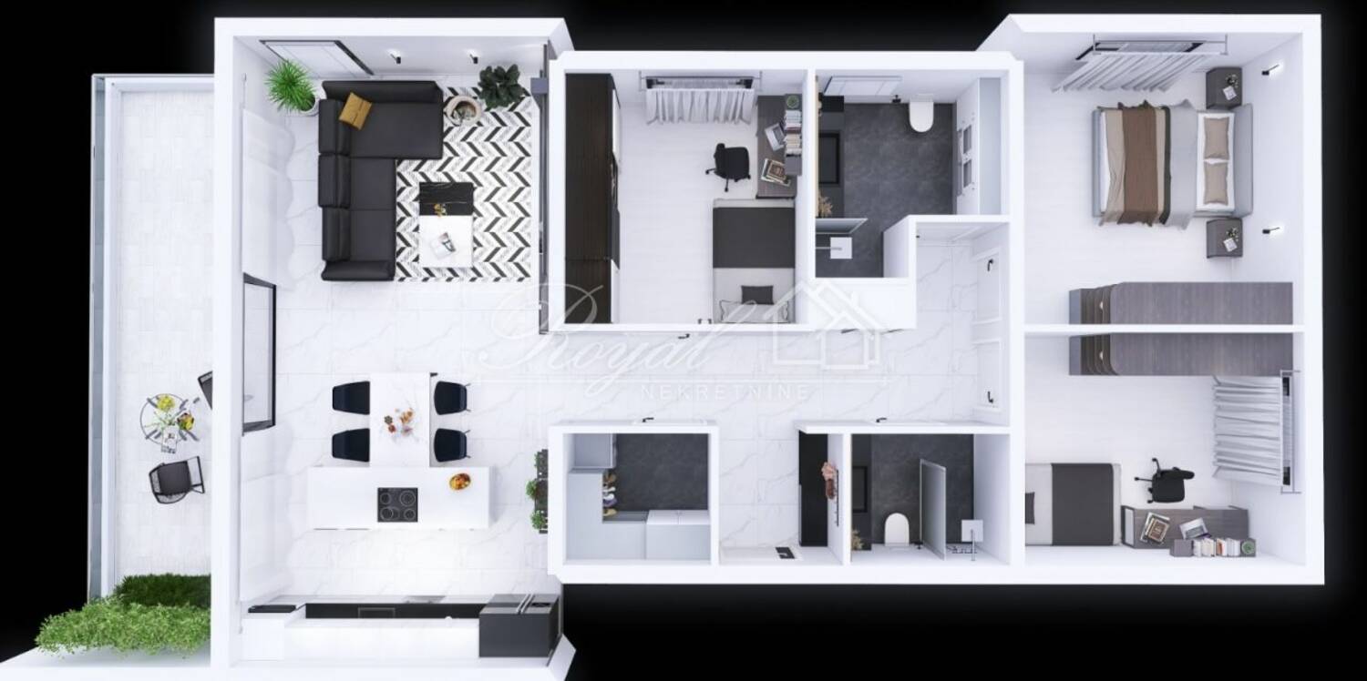 Sastoji se od kuhinje a BLgVonicom i dnevnog boravka u otvorenom prostoru hodnika, tri spavaće sobe, dvije kupaonioce, ostave, natkrivene terase.