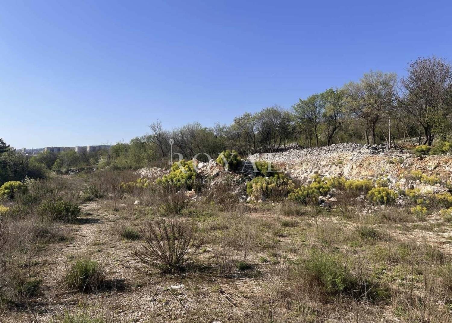 Zemljište je 2024. godine u potpunosti očišćeno od drveća i niskog raslinja, a teren je poravnat i pripremljen za buduću gradnju, što značajno smanjuje početne troškove investicije. Na fotografijama je vidljivo prirodno kamenito tlo karakteristično za priobalne krajeve, s uređenim pristupom i prohodnim putem duž parcele.