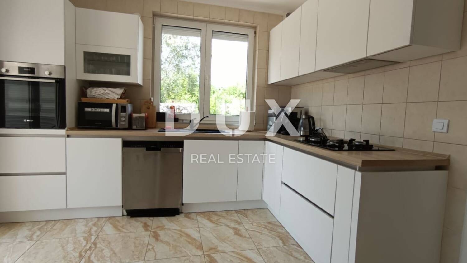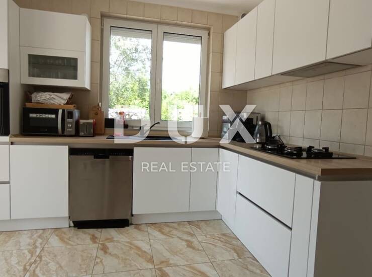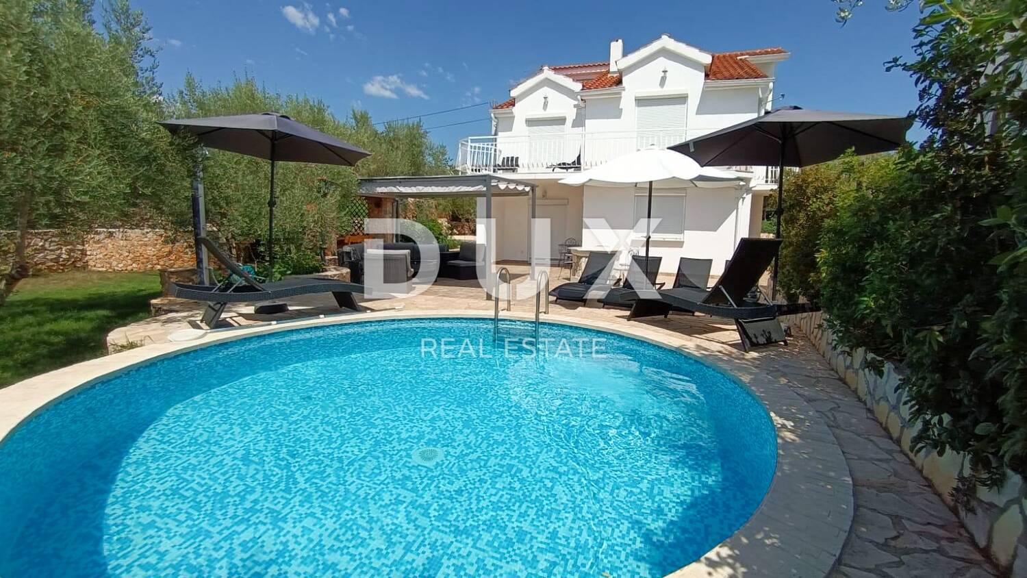 Prodaje se samostojeća kuća s bazenom na mirnoj lokaciji okružena prirodom udaljena 900 m od mora. Kuća se sastoji od prizemlja, prvog i drugog kata te podruma, okružena zelenilom s mnogo maslina u dvorištu. U prizemlju nalaze se dnevni boravak i kuhinja s izlazom na vrt i bazen te kupaonica. Na prvom katu su 3 spavaće sobe, kupaonica i dnevni boravak s velikom terasom s pogledom na more. Na drugom katu nalaze se dvije spavaće sobe. Svaka soba ima vlastiti klima uređaj kao i radijator na centralno grijanje. U podrumu su dvije sobe od kojih je jedna soba za igre a druga trenutno služi kao ostava. Kuća ima predivan vrt s bazenom i maslinama, kao i ljetnu kuhinju s roštiljem. Veliki parking omogućuje komotno parkiranje vozila.