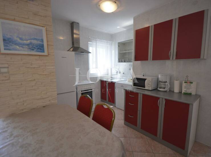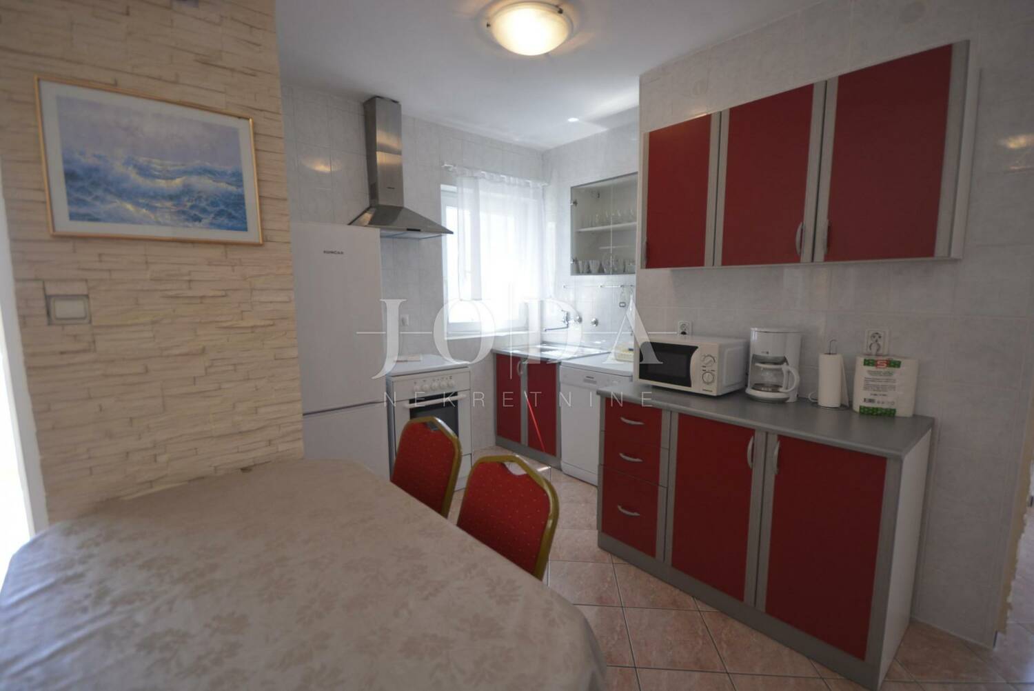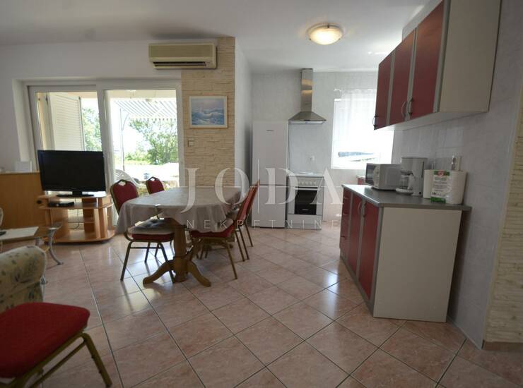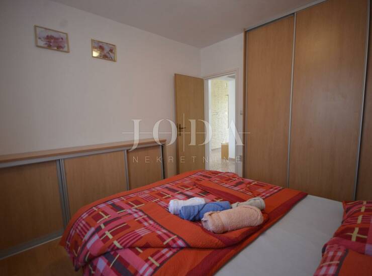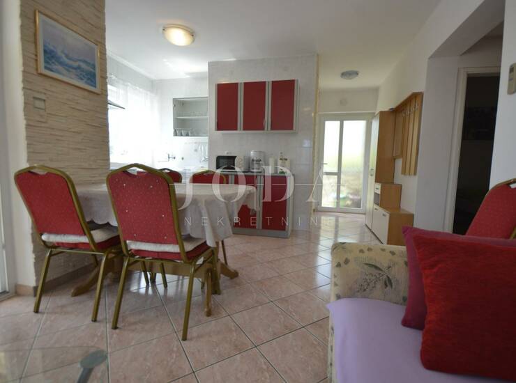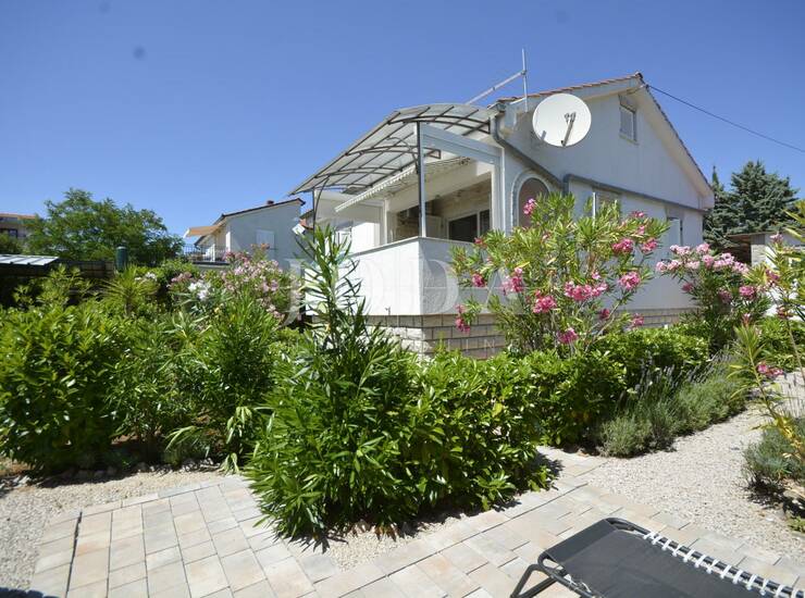 Na svakoj etaži nalazi se po jedan dvosobni stan s kuhinjom, dnevnim boravkom, blagovaonom i kupaonom. Stan u prizemlju ima i prostrani balkon. Kuća je namještena, klimatizirana, ima PVC stolariju. Na prekrasno uređenoj okućnici nalazi se konoba i sjenica (cca 20 m2) s kaminom. Nekoliko parkirnih mjesta na parceli. Kuća se nalazi na lijepoj, mirnoj lokaciji, cca 850 m od mora!