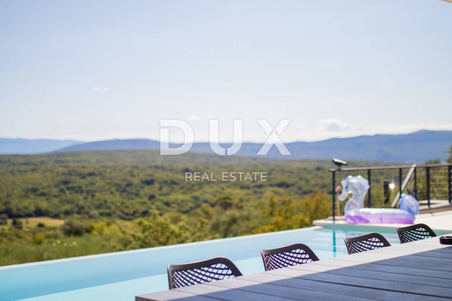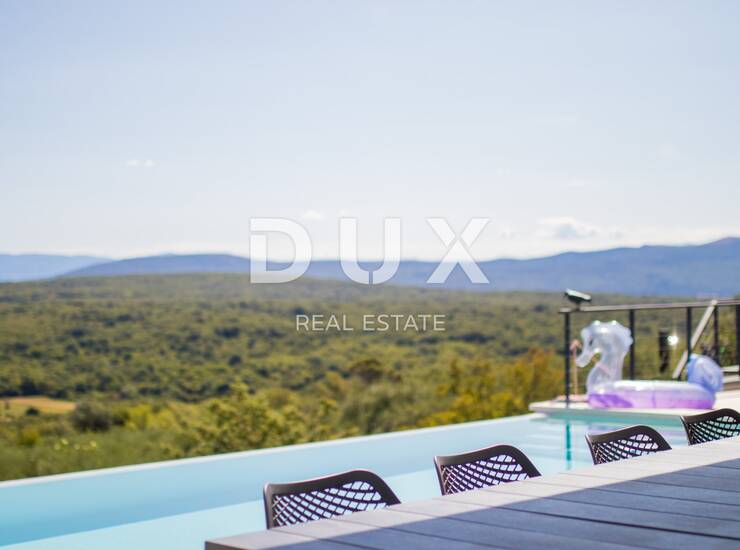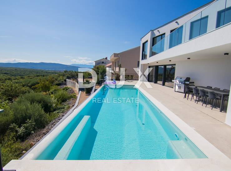 Ova prekrasna moderna vila sagrađena je na parceli od 730 m2 i nalazi se nedaleko grada Krka uz sam rub građevinske zone na uzvišenom položaju koji garantira panoramski pogled zauvijek.