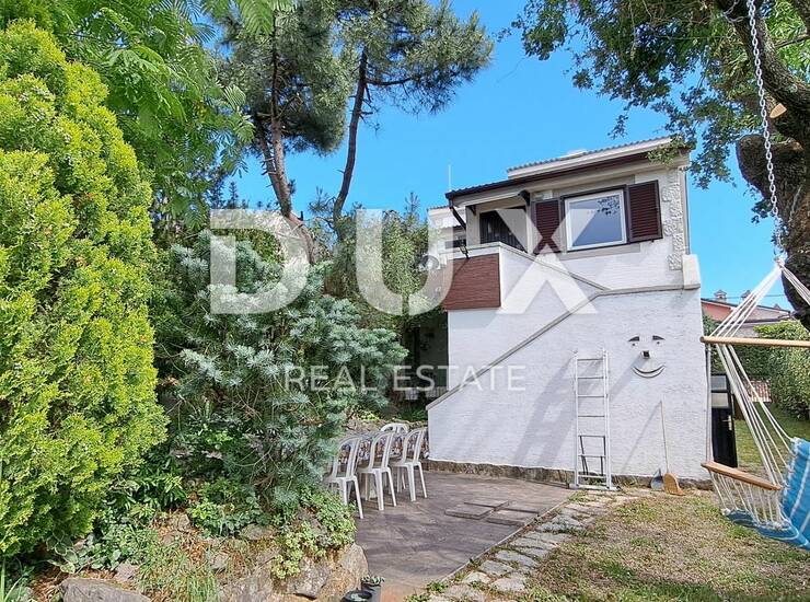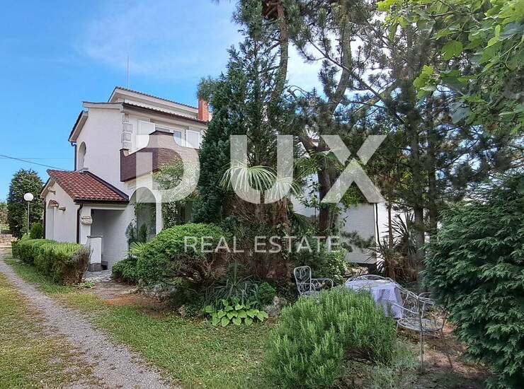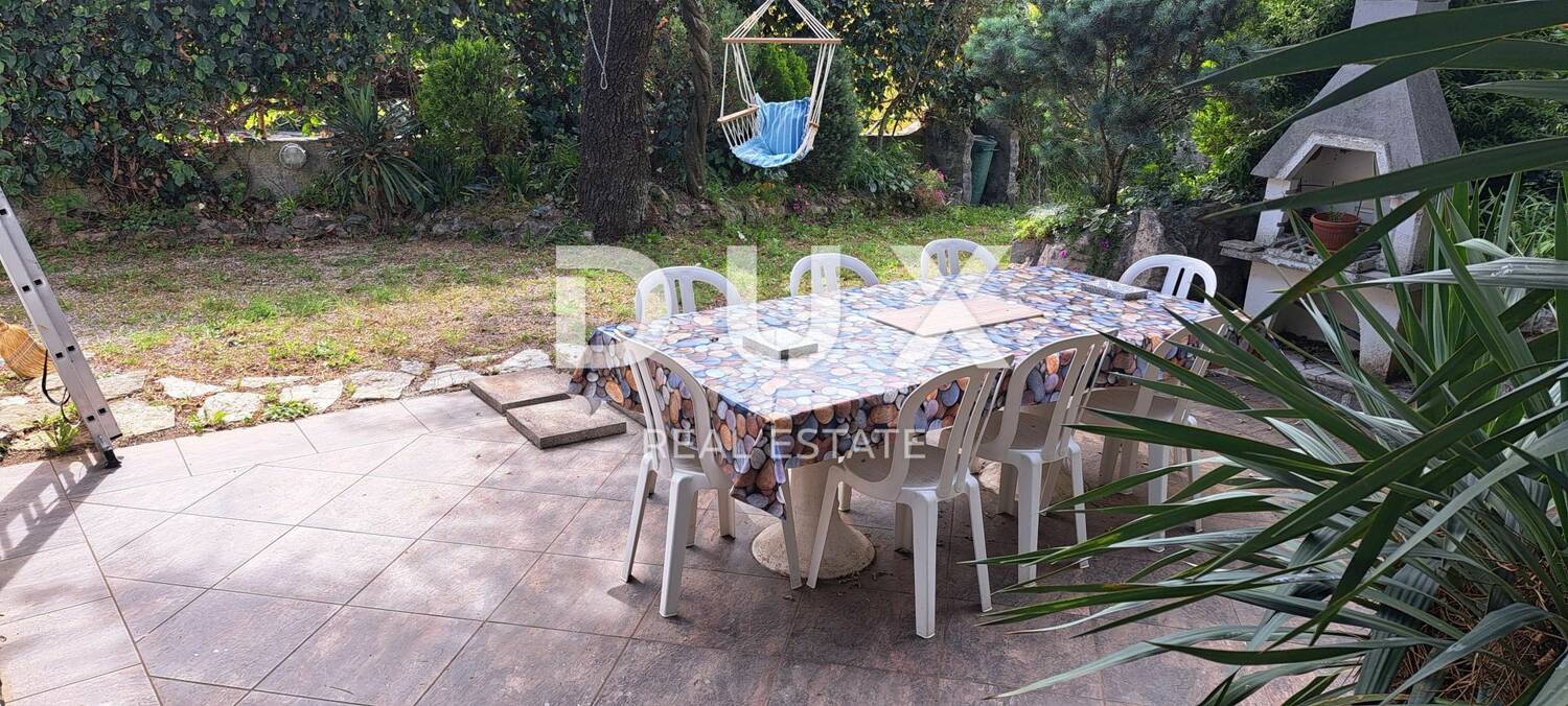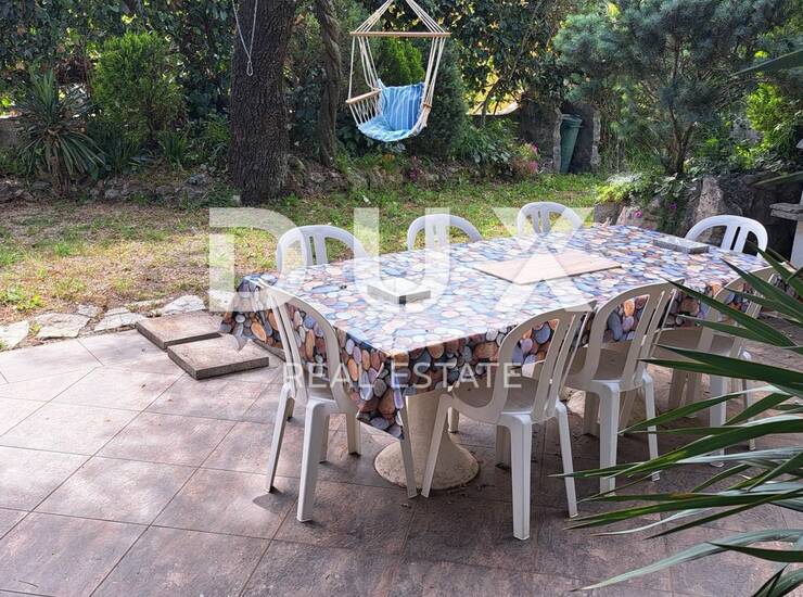 Velika okućnica je uređena s više terasa, mediteranskog bilja, velikim parkingom, vrtnom kućicom te dodatnog zemljišta s mogućnošću izgradnje još jednog stambenog objekta.