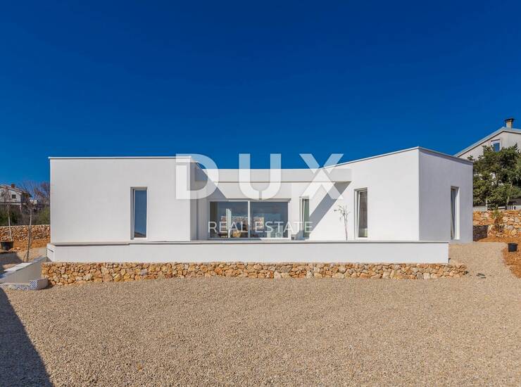 OTOK KRK, šire područje grada Krka - Luksuzna moderna vila s bazenom i pogledom na more. Vila je prizemnica jedinstvenog, modernog dizajna i smještena je na parceli od 700 m2. Sastoji se od tri spavaće sobe, svake s vlastitom kupaonicom, velikog prostora dnevnog boravka, blagavaonice i kuhinje, hodnika, spremišta i WCa. Sadrži veliku natkrivenu terasu (površine 31,5 m2), te bazen (površine 30 m2) sa sunčalištem i pergolom. Kuća je okrenuta prema jugu i nalazi se na mirnoj lokaciji uz zelenu zonu, a opet na svega 1 km od mora. Kuća će biti opremljena vrhunskom opremom i keramikom, s ugrađenim podnim grijanjem i uređenom okućnicom u mediteranskom stilu. U ovoj fazi, budući vlasnik može birati dio opreme kuće u skladu s troškovnikom.