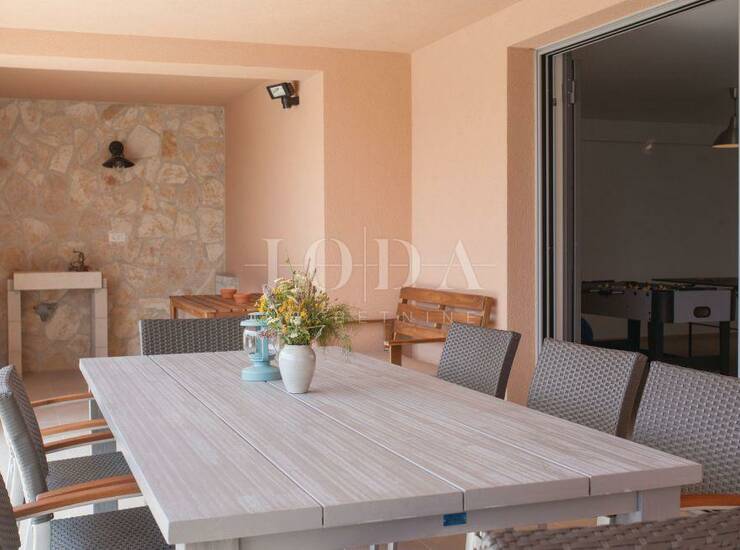 Okućnici ove nekretnine na moru pripada i prekrasan veliki bazen površine 24 m2 te 7 parkirnih mjesta za vlasnika, njegovu obitelj i njegove goste.