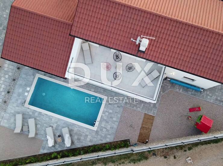 Okućnica je ograđena, ima automatsko navodnjavanje i prekrasan grijani bazen sa uređenim sunčalištem.