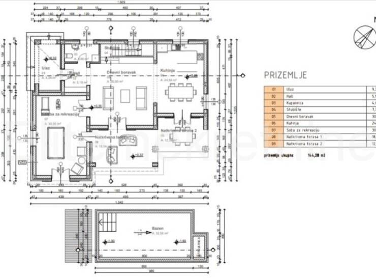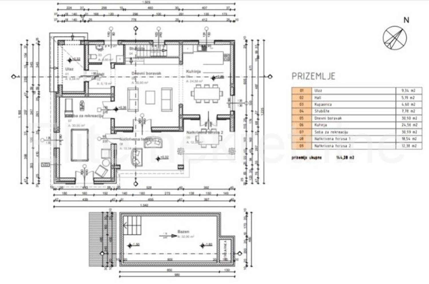 U prizemlju ville bit će smješten ulazni dio, kuhinja, prostrani dnevni boravak, soba za rekreaciju, kupaonica te 2 natkrivene terase. Na katu nalazit će se 4 spavaće sobe, 4 kupaonice te još jedna natkrivena terasa.