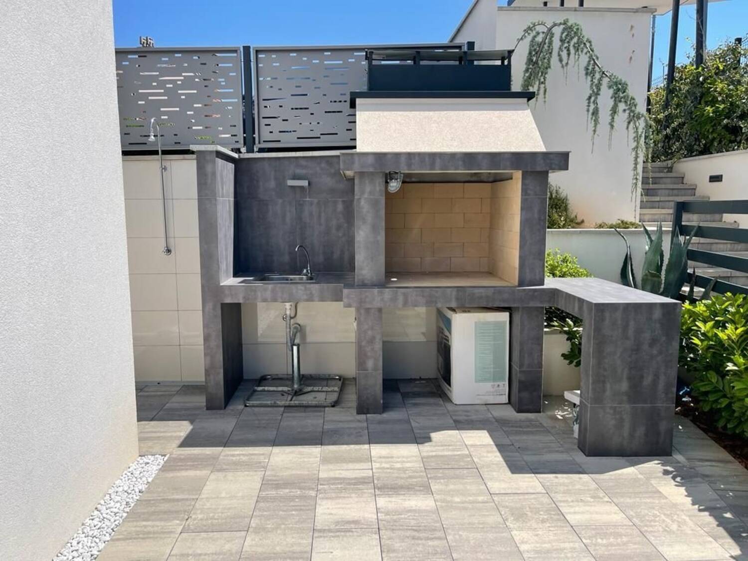 Gornji stan 98 m2 sastoji se od tri spavaće sobe s vlastitim kupaonicama i wc-om te kuhinjom, blagovaonom, dnevnim boravkom i dva prostrana balkona.