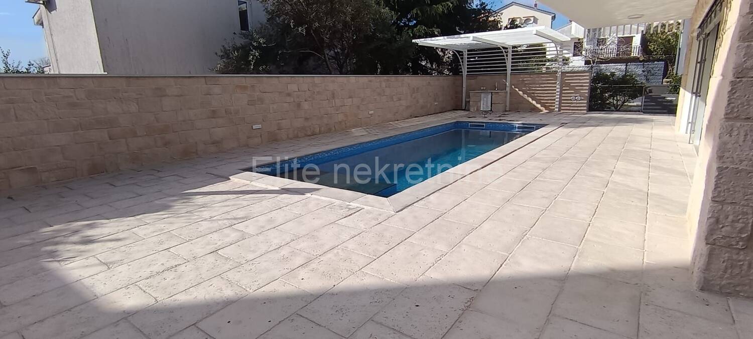 * Porotherm opeka + beton visoke klase* Energetski učinkovita fasada (15 cm)* Aluminijska stolarija **Cortizo**, troslojna stakla* Električne rolete + komarnici* Podno grijanje **Daikin** toplinskom pumpom* Klima uređaji u svakoj prostoriji (**Daikin Multi**)* Talijanska keramika i hrastov troslojni parket* Protuprovalna vrata **Dierre*** TV sustavi u svim sobama + Smart TV* Sigurnosni sustavi: **alarm + videonadzor*** Kvalitetna rasvjeta i vanjski dekorativni kamen* Namještaj po mjeri renomiranih proizvođača* Bosch ugradbeni kućanski uređaji* Profesionalna oprema bazena s automatizacijom