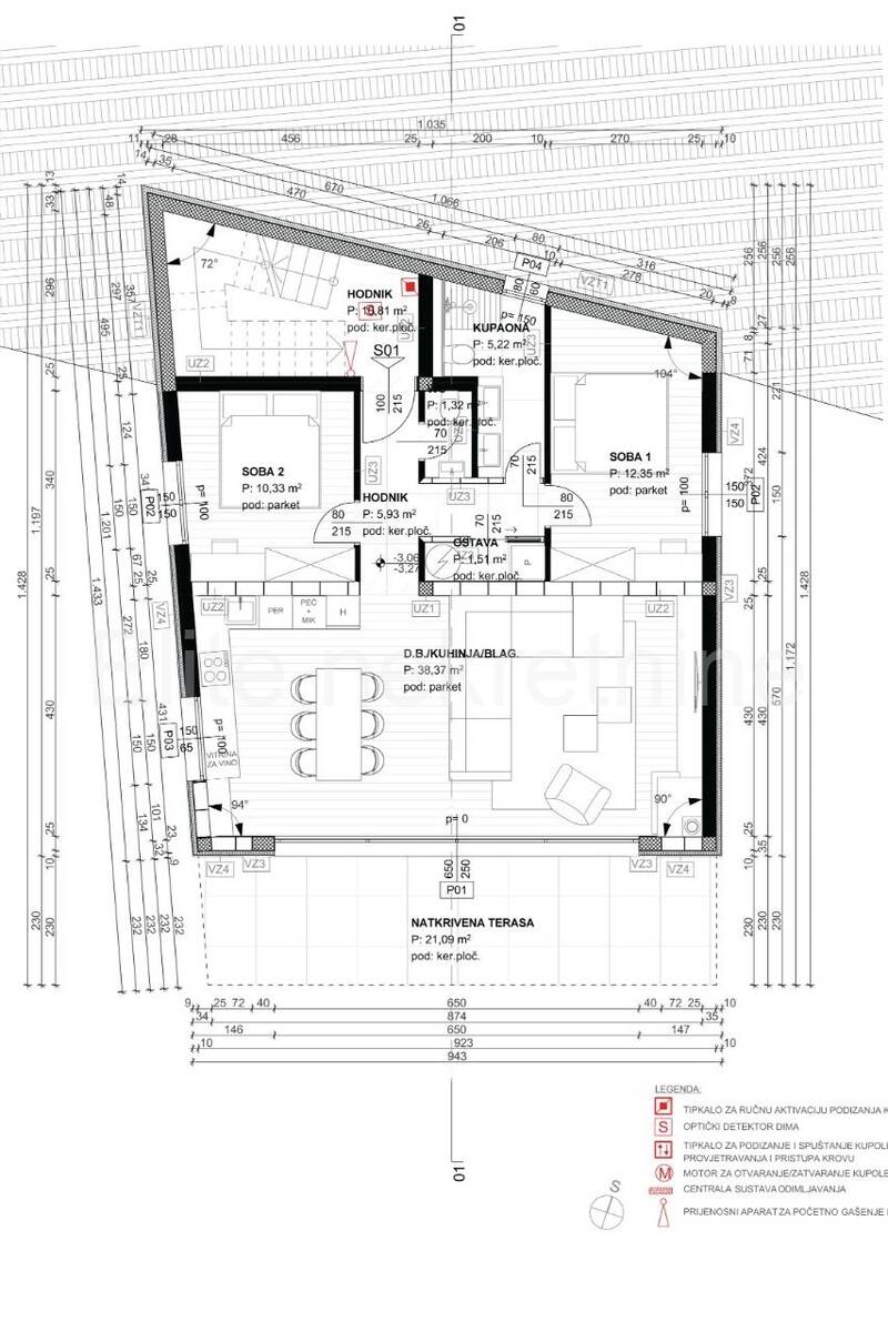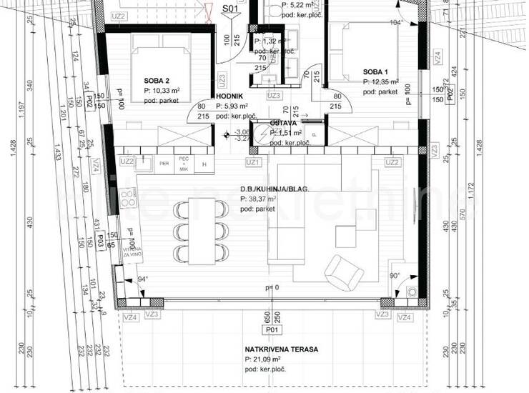 terasa 22,70 m²2 parkirna mjesta: PM1 i PM6, svako po 13,00 m²
