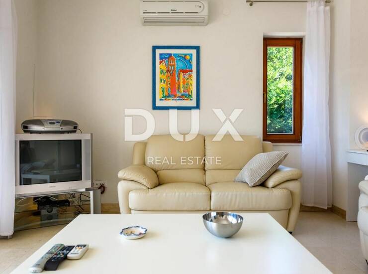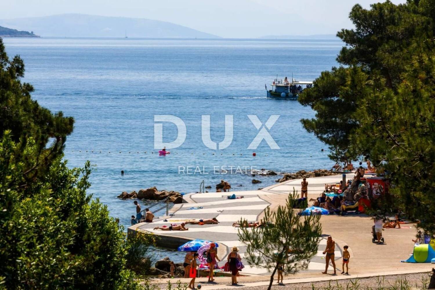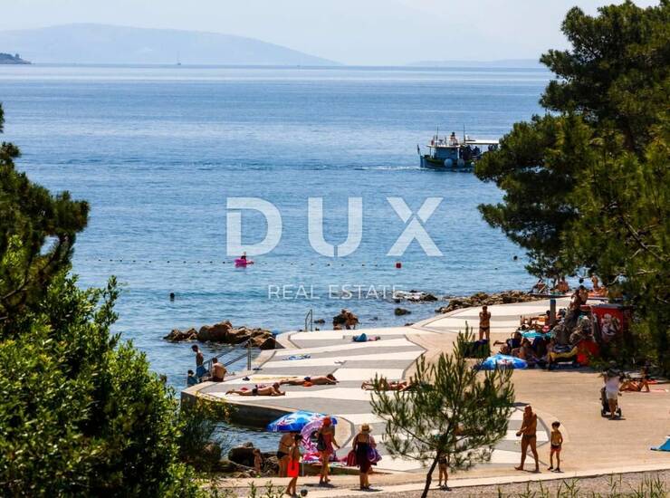 Apartman trosobni s dnevnim boravkom na izuzetnoj lokaciji PRVI RED DO MORA. Kuća se nalazi prvi red do mora, odmah iznad plaže, na mirnoj lokaciji, okruženoj zelenilom. Sastoji se od dve spavaće sobe, dve kupaonice, dnevnog boravka, kuhinje i blagovaone, te velike terase s pogledom na more. Izrazita rijetkost na tržištu! Apartman je potpuno nov, građen modernim tehnikama gradnje i opremljen kvalitetnom keramikom i stolarijom. Ima podno grijanje u svim prostorijama, TV, opremljenu kuhinju s perilicom posuđa i pećnicom te 2 kupaonice s kadom ili tušem.