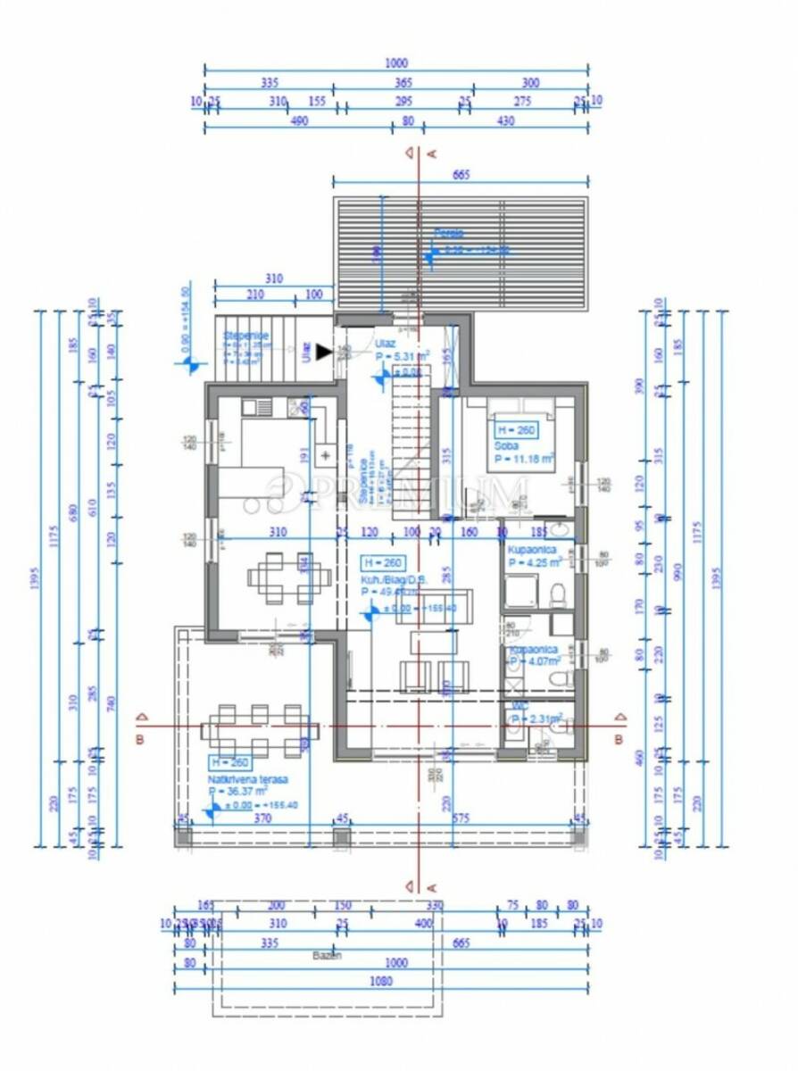 U prizemlju je planiran ulazni prostor, kupaonica, zaseban WC, spavaća soba s vlastitom kupaonicom te prostrani open space dnevni boravak s kuhinjom i blagovaonicom. Iz dnevnog dijela izlazi se na natkrivenu terasu površine 36 m², koja je povezana s okućnicom. Prema projektu, na okućnici su predviđeni bazen i sunčalište.