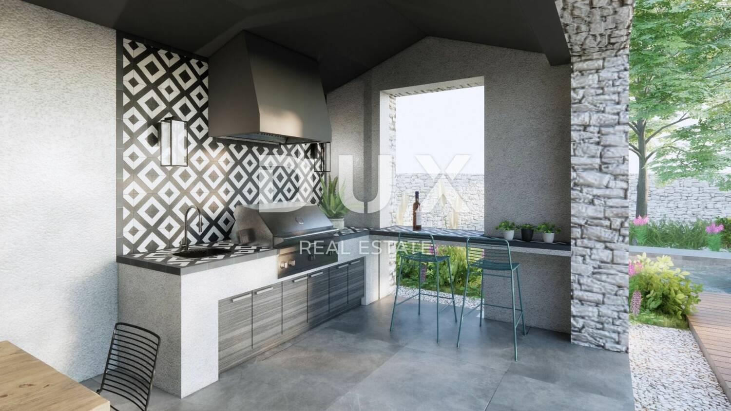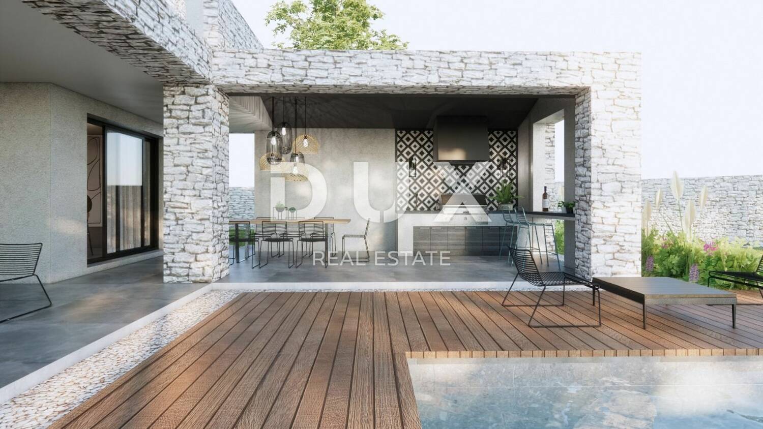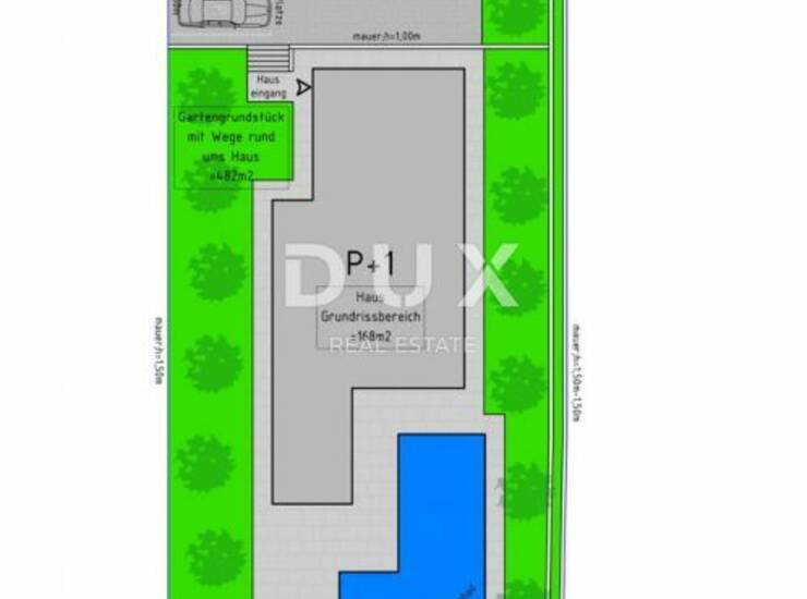 Na zemljištu je projektirana vila dvokatnica od 168 m2 s bazenom od 56 m2, okućnicom 482 m2 i 123 m2 parkirnog popločanog dijela.