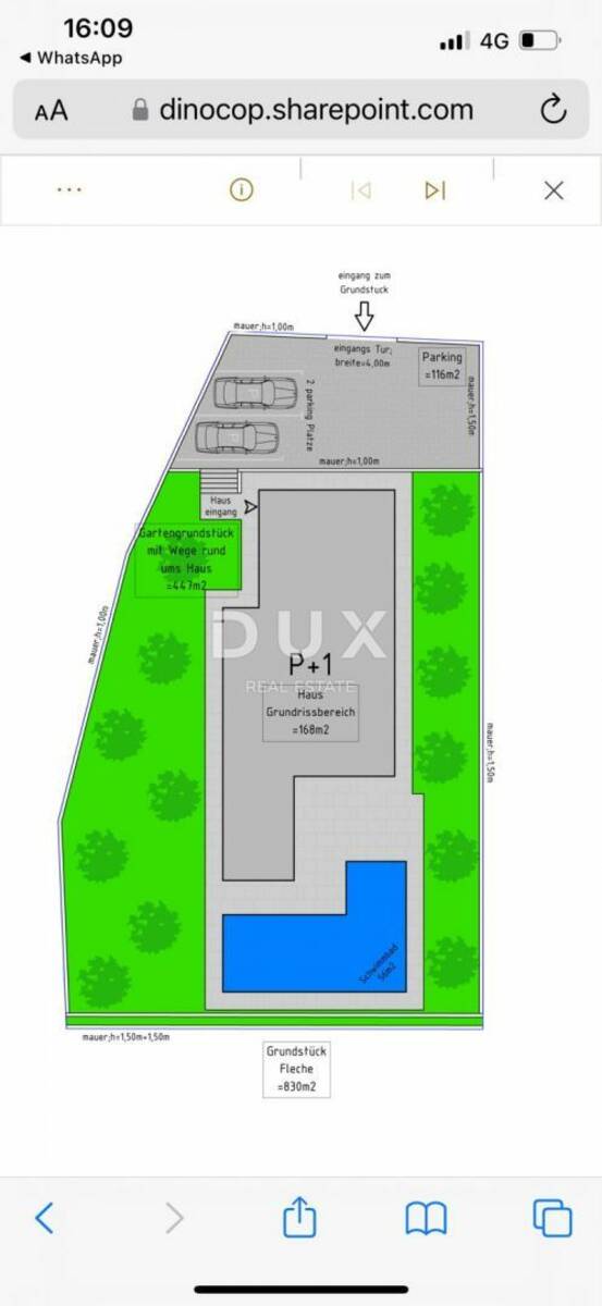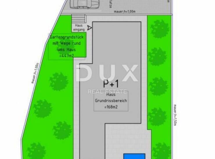 Na zemljištu je projektirana vila dvokatnica od 168 m2 s bazenom od 56 m2, okućnicom 447 m2 i 116 m2 parkirnog popločanog dijela.