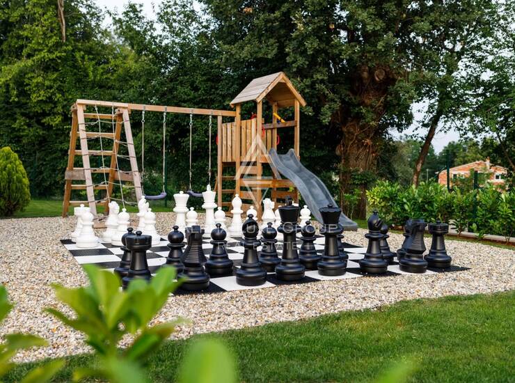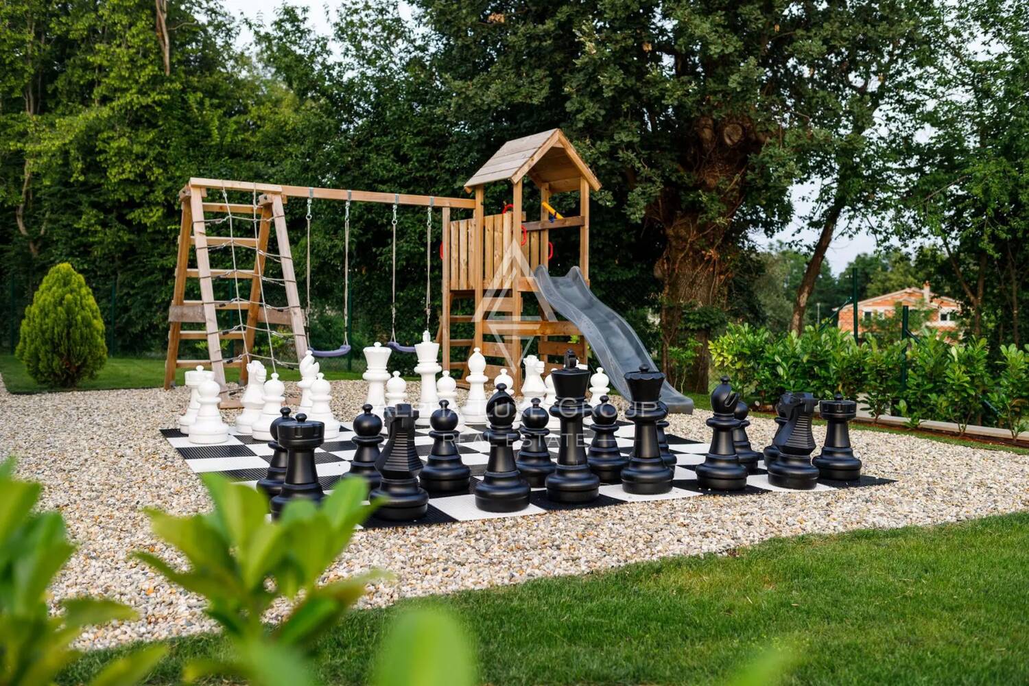 Impresivna vila nalazi se na velikoj parceli od 1.572 m² i obuhvaća 290 m² elegantnog unutarnjeg prostora raspoređenog na dvije etaže. U prizemlju se nalazi svijetao open-space dnevni boravak s velikim smart TV-om, PlayStation konzolom i udobnim lounge dijelom, povezan s blagovaonicom za osam osoba i potpuno opremljenom suvremenom kuhinjom. Odvojeni ured pruža mir i privatnost čak i tijekom odmora.