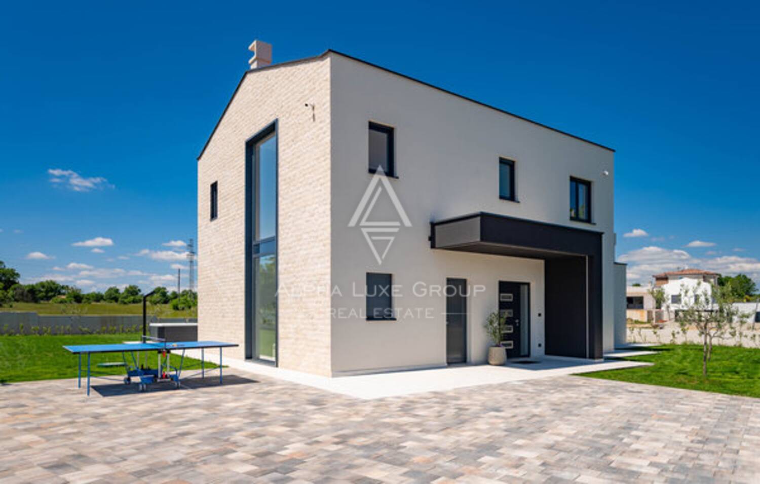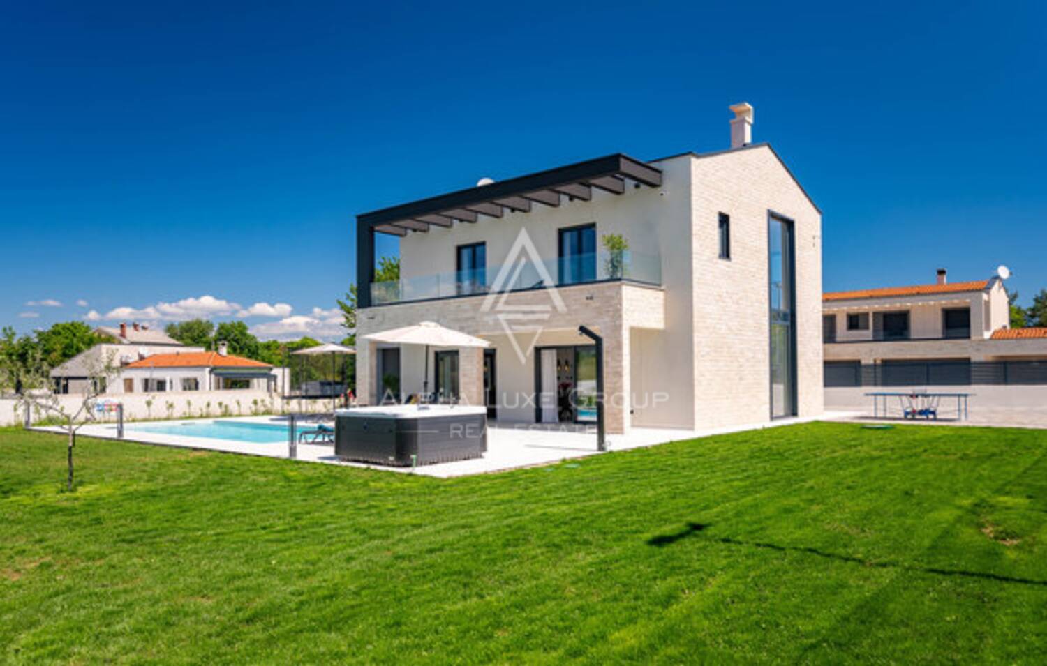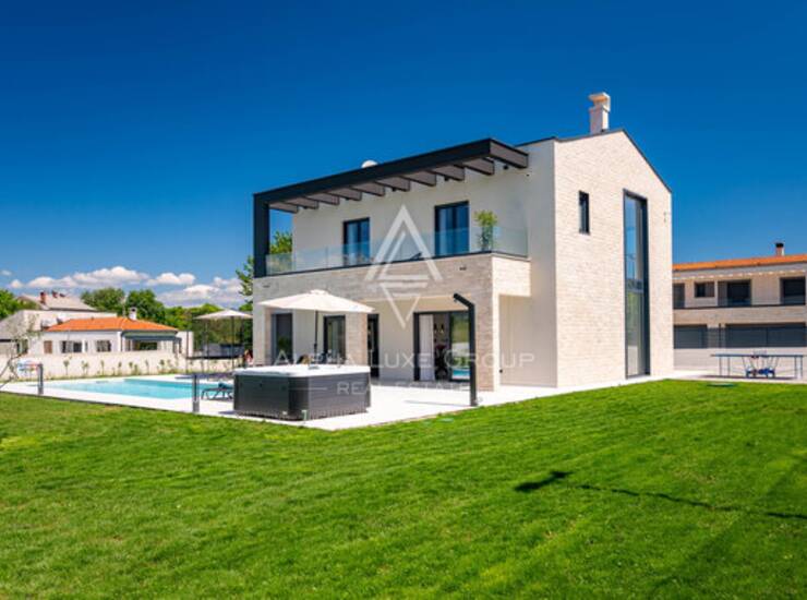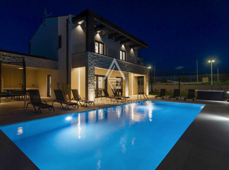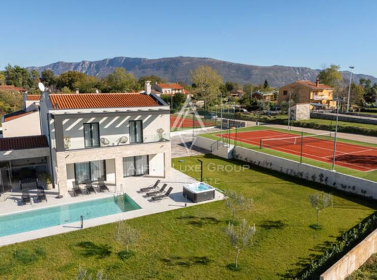 Eksterijer je jednako dojmljiv, s potpuno ograđenim i lijepo uređenim vrtom koji uključuje automatsko navodnjavanje, moderan bazen sa sunčalištem i privatni teniski teren. Promišljena organizacija prostora, kvalitetna gradnja i pažljivo odabran namještaj stvaraju iznimno ugodno okruženje prikladno za svakodnevni život ili luksuzni turistički najam.