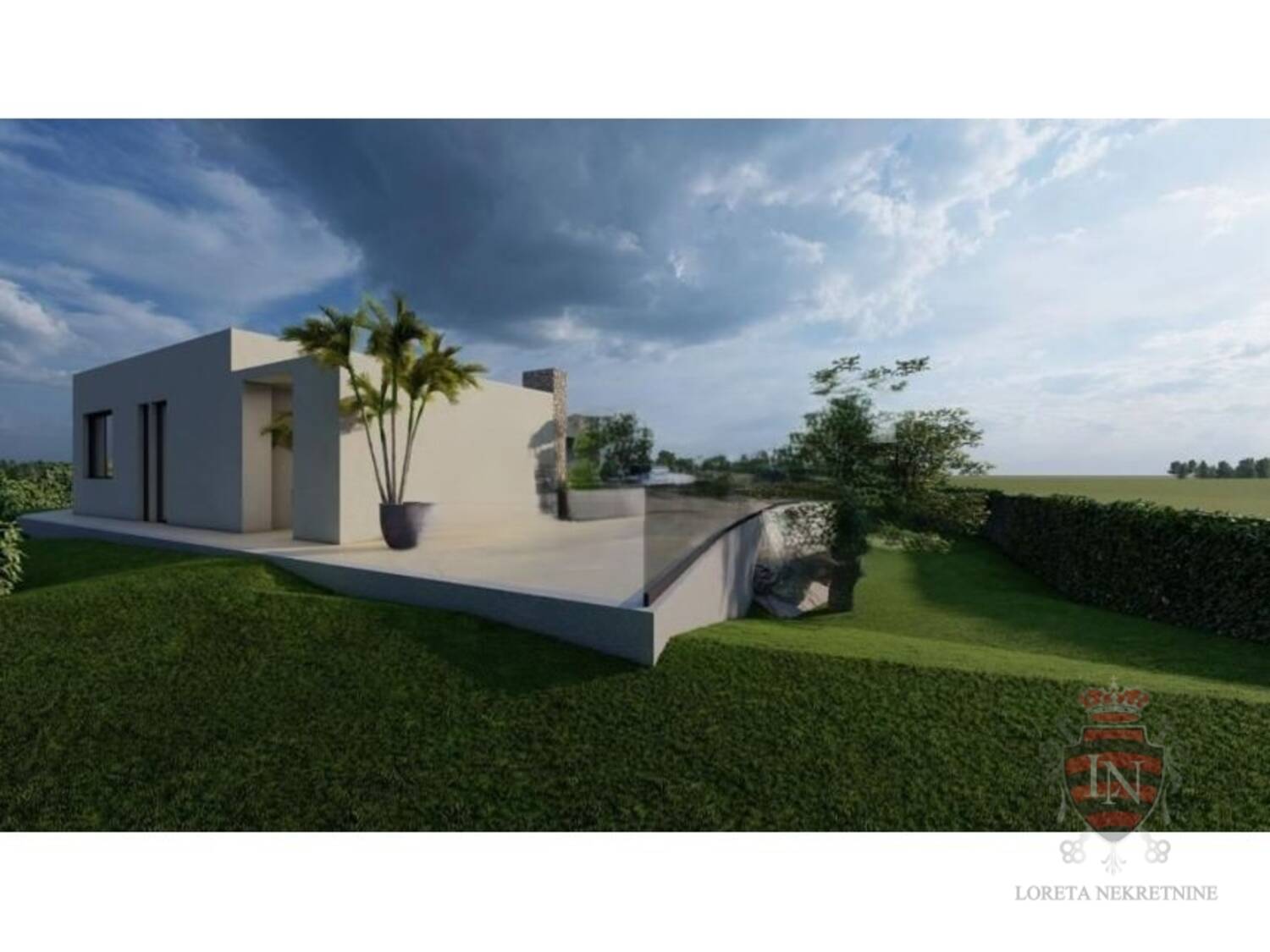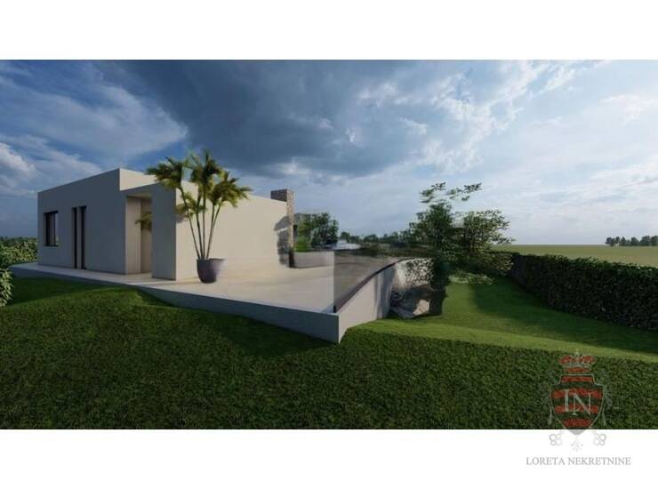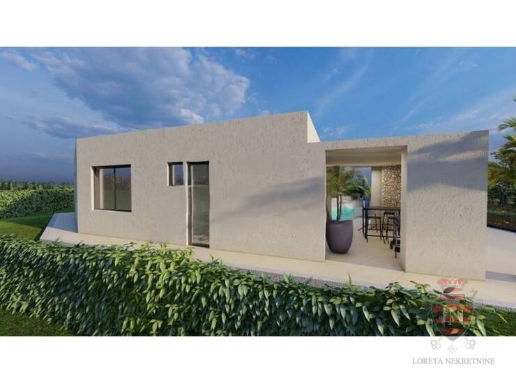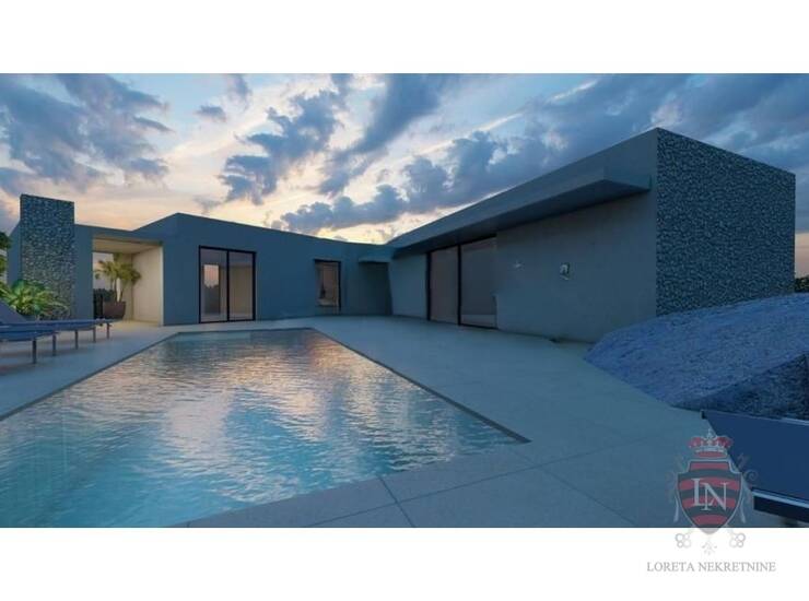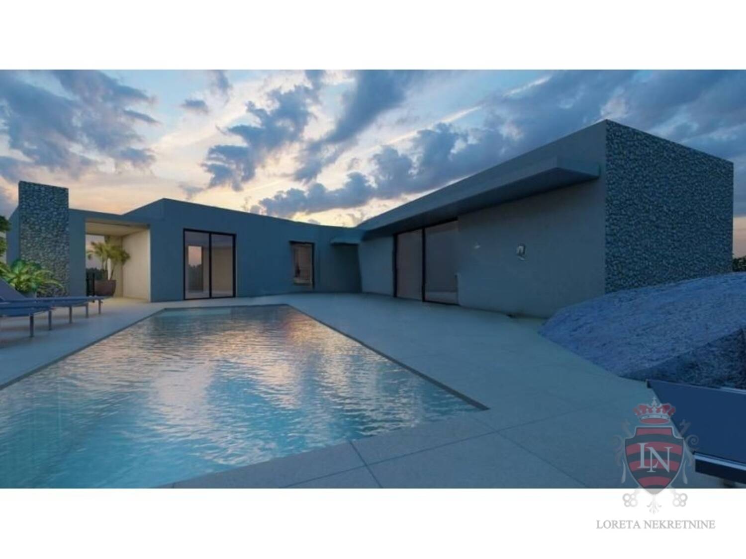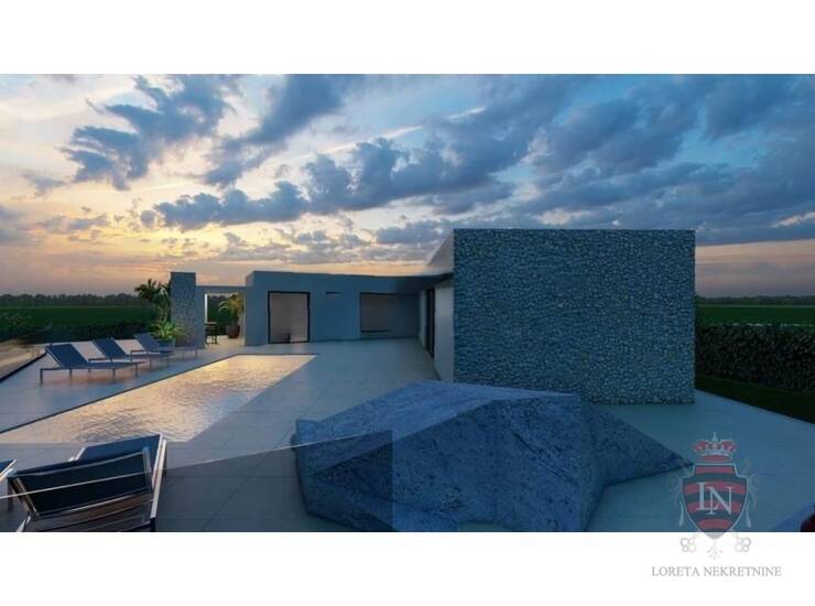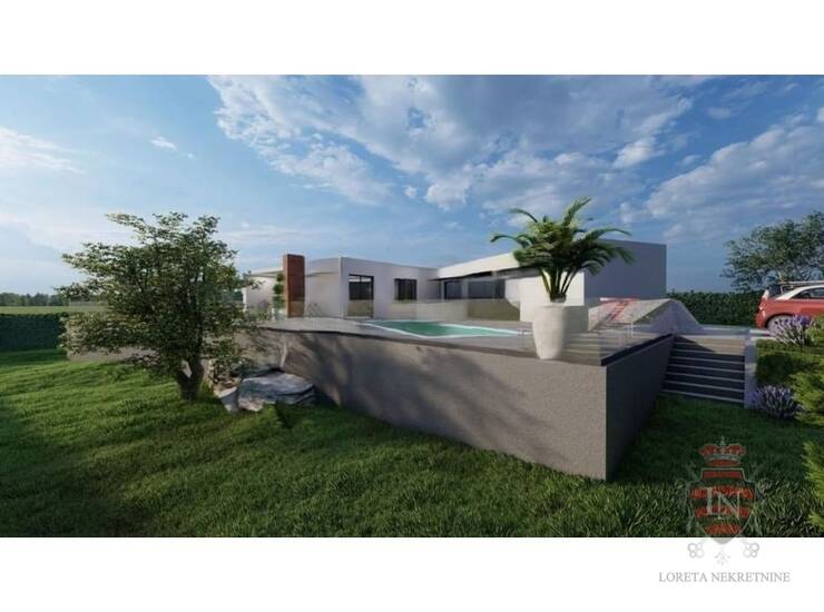 Ova moderna prizemnica s bazenom, smještena na parceli od 974 m², ima drugačiji arhitektonski koncept nudeći svjež i suvremen dizajn.