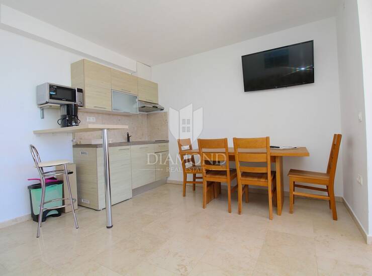 U ponudi naše agencije imamo izvrsnu poslovnu priliku i rijetkost na tržištu - apartmansku kuću sa bazenom i sa sedam zasebnih apartmana na odličnoj lokaciji, drugi red do mora. Tri apartmana sastoje se od dvije spavaće sobe, dvije kupaonice, gostinjskog toaleta te opremljene kuhinje i dnevnog boravka sa izlazom na balkon sa kojega se pruža nezaboravni pogled na more i zelenilo. U većim, dvosobnim apartmanima može boraviti 4-6 gostiju.
